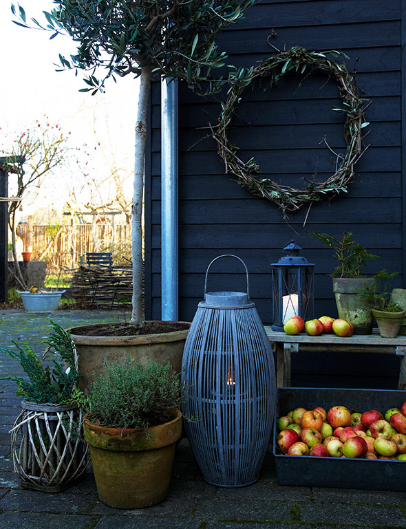 – Vores jul falder nok lidt tidligere end normalt. Når det bliver efterår, går jeg i gang med at bygge tableauer op udenfor med ting, jeg har fundet på mine rideture eller på gåture med familien. Mosklædte grene, æbler og flettede kranse sammen med et par lysende lanterner giver en fantastisk stemning, fortæller Camilla, som ejer livsstilsbutikken No17.