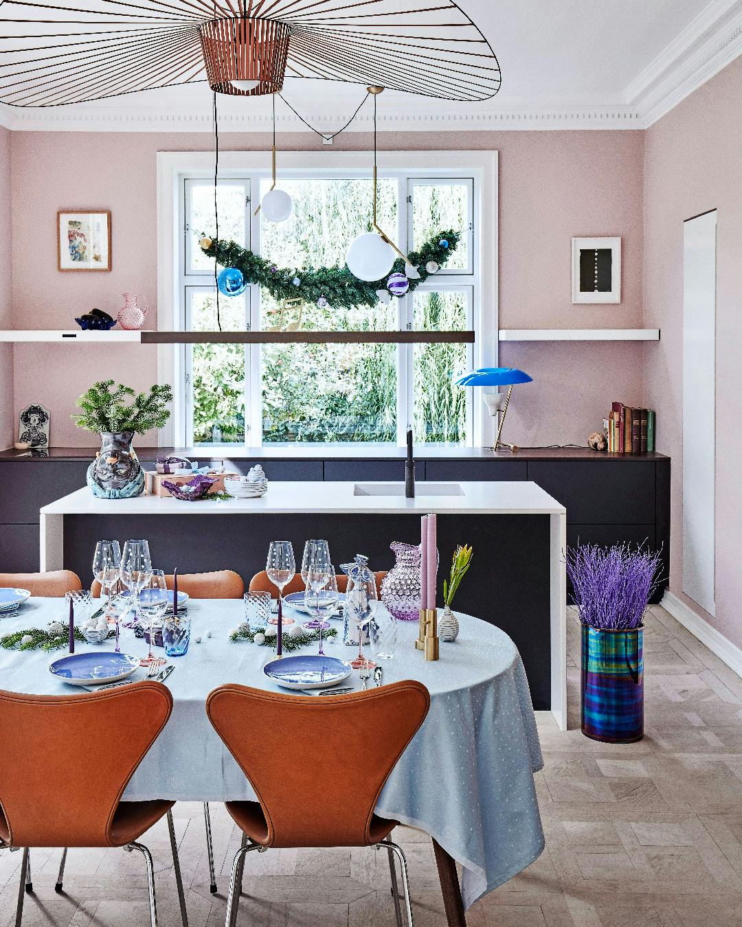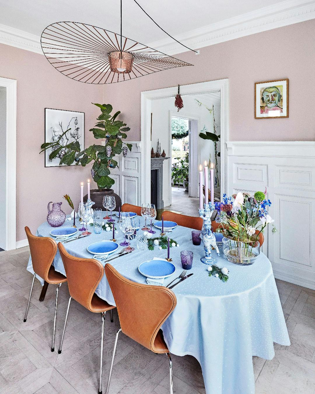 Dæk et sart julebord i blå og lilla toner. Med slanke glas og strøget dug får det alligevel et klassisk udtryk i opdateret version. Den blå bordlampe er fra Astep, og lampen i loftet er Vertigo pendant-lampen fra Petite Friture. Syverstolene er fra Fritz Hansen, køkkenet fra Uno Form og gulvvasen fra Tom Dixon Studio.