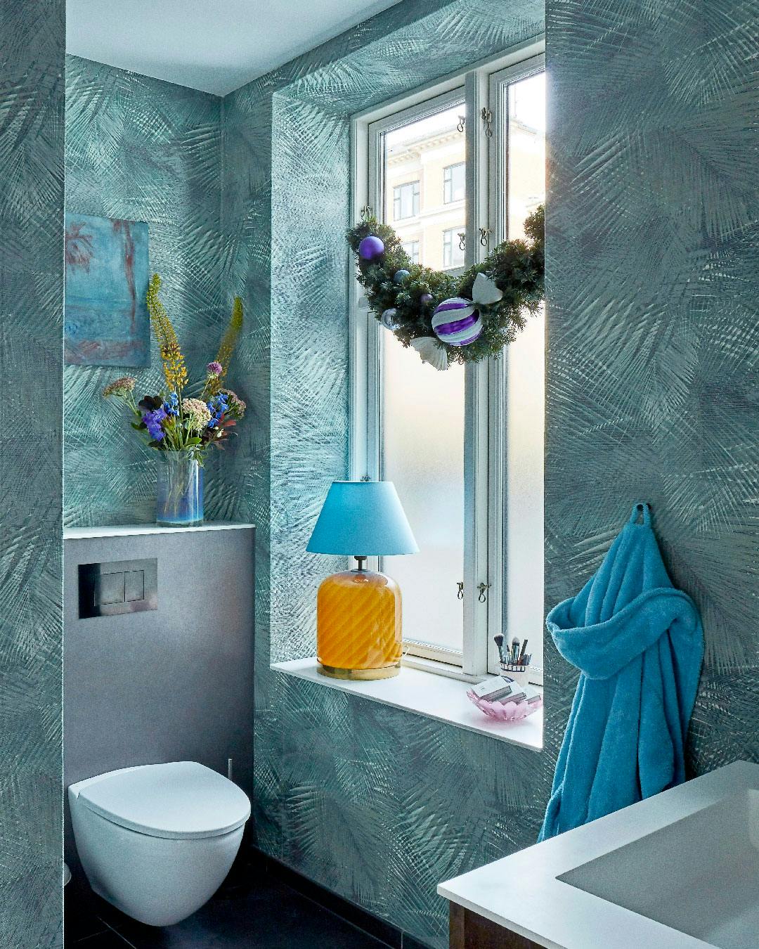 Er badeværelset lille, så undlad at overpynte det, men stil kun udsmykning i vinduerne. Tapetet er fra Tapetforum, lampefoden er fra Tommaso Barbi, og lampeskærmen er fra Camille Helene. Juleranke og pynt er fra Hofflands.