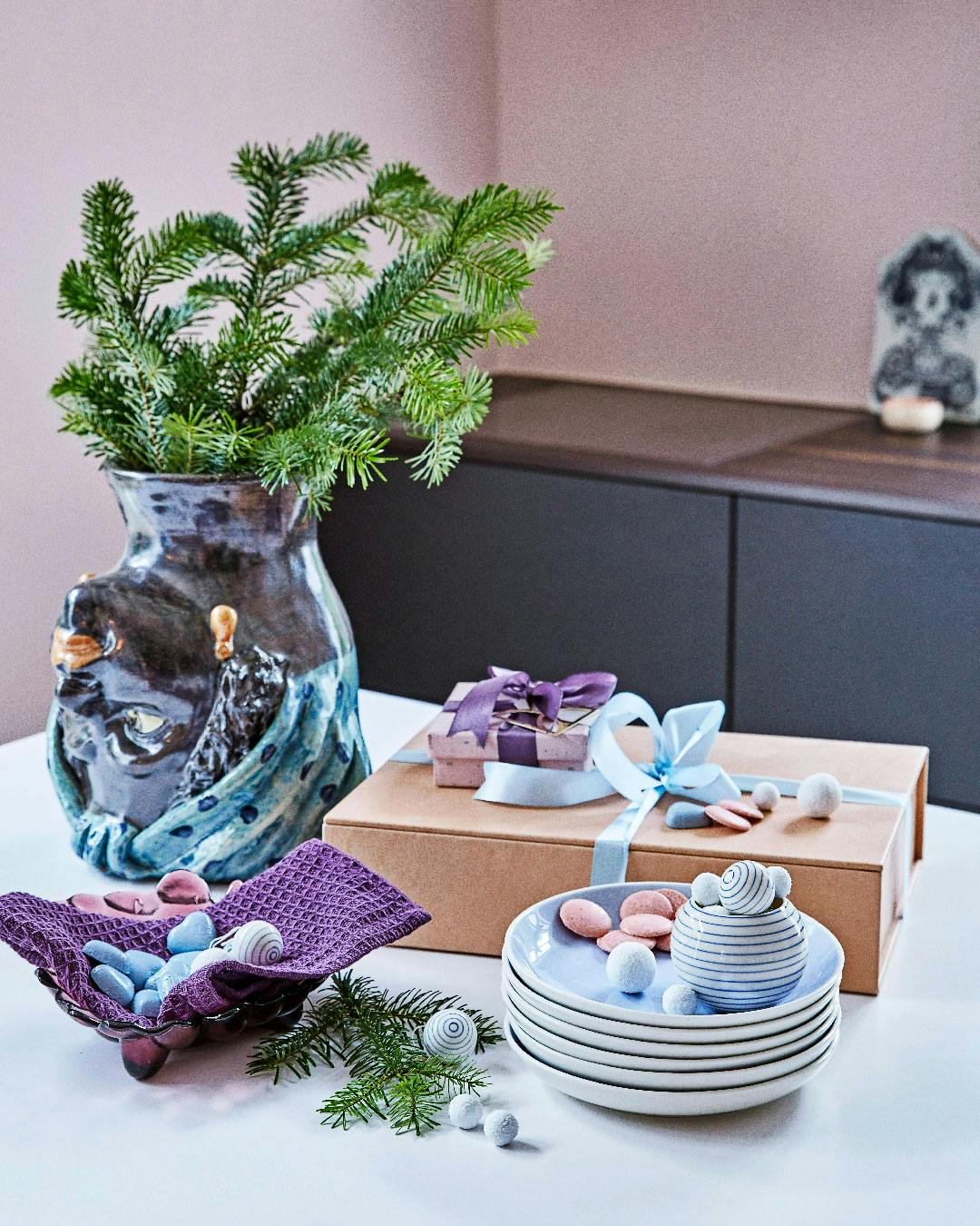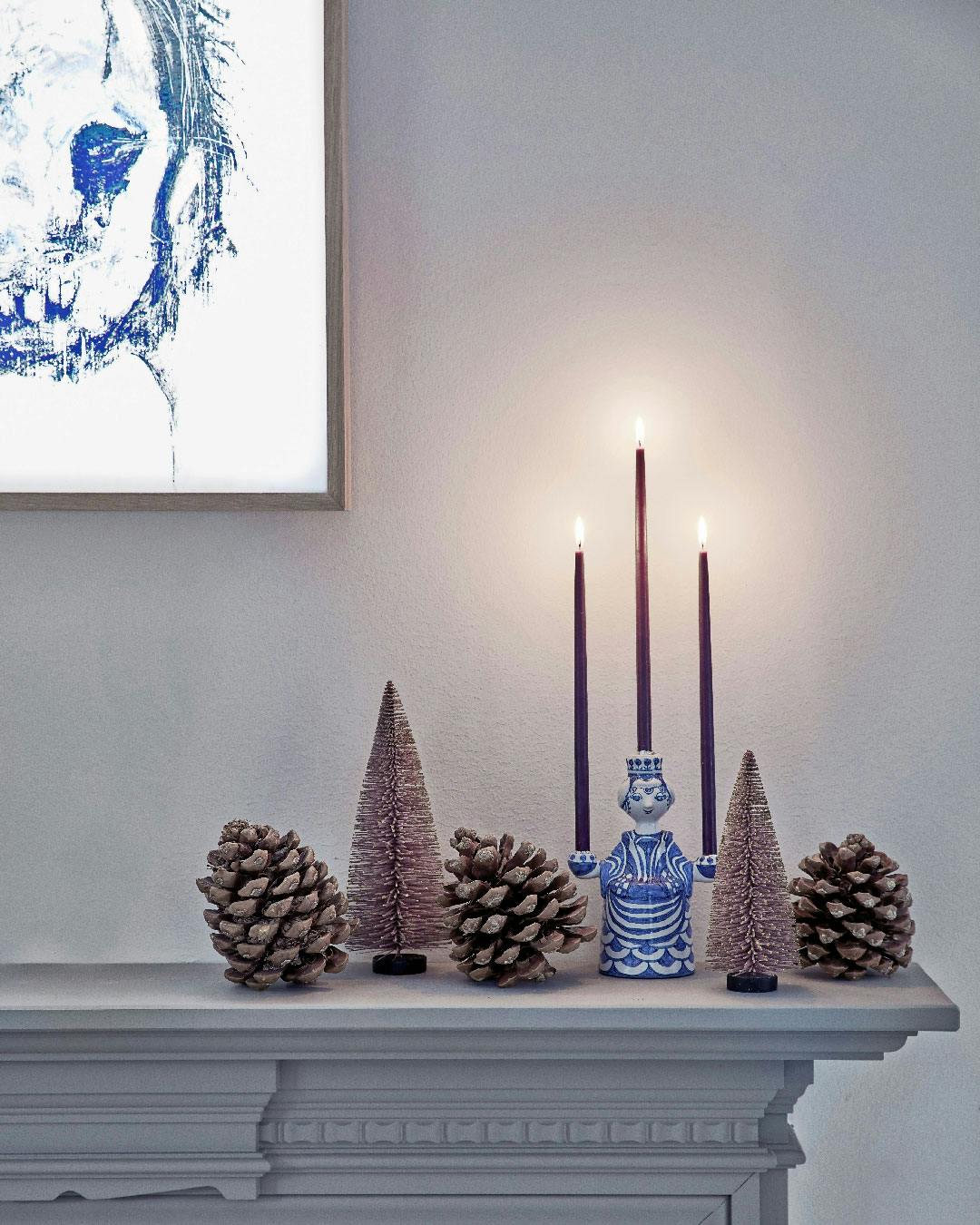 Det giver ro til øjet, hvis der indimellem er enkle opstillinger, hvor de samme elementer bliver gentaget, som fx her kogler med små juletræer fra Søstrene Grene. Vintageskulpturen er af Bjørn Wiinblad.