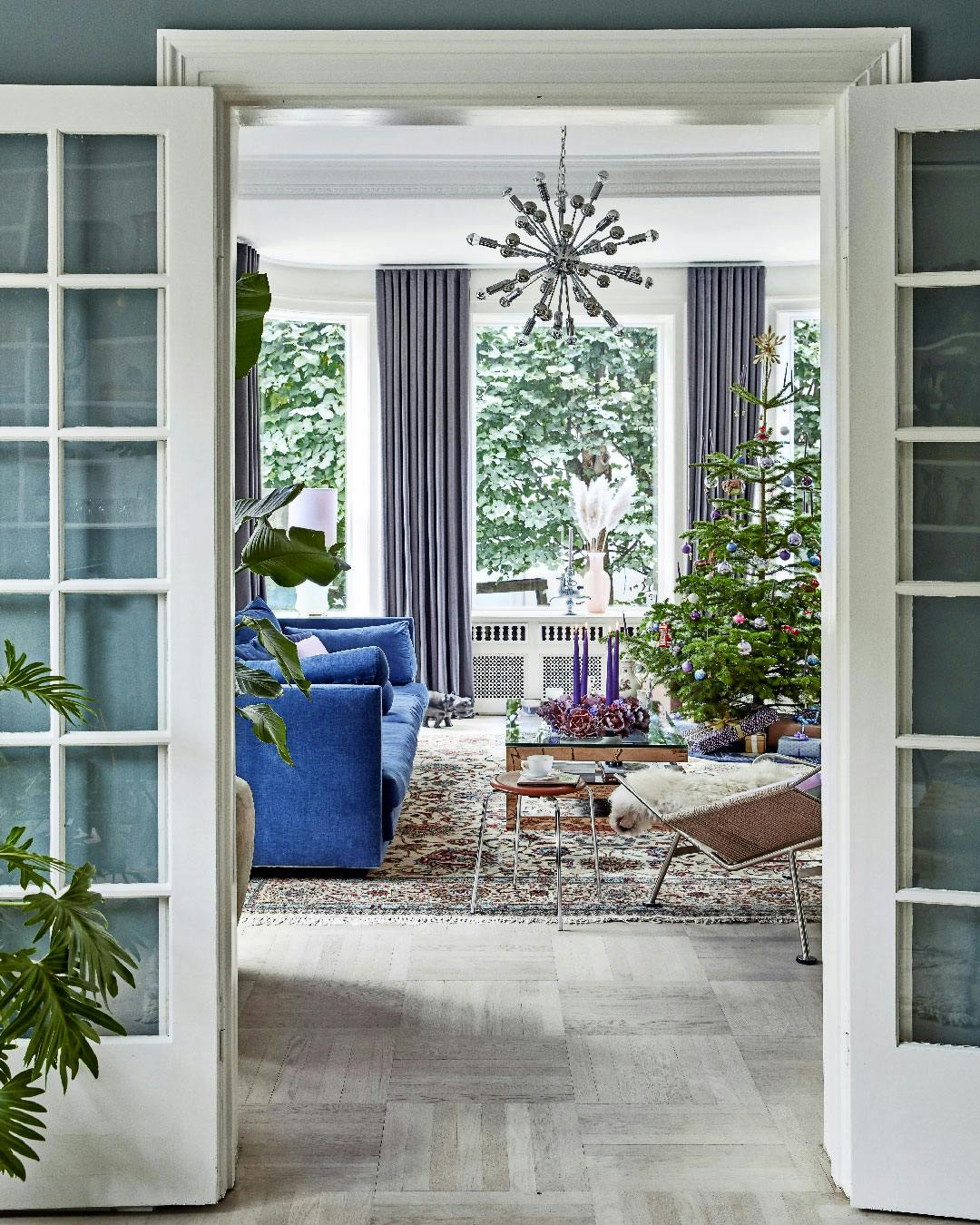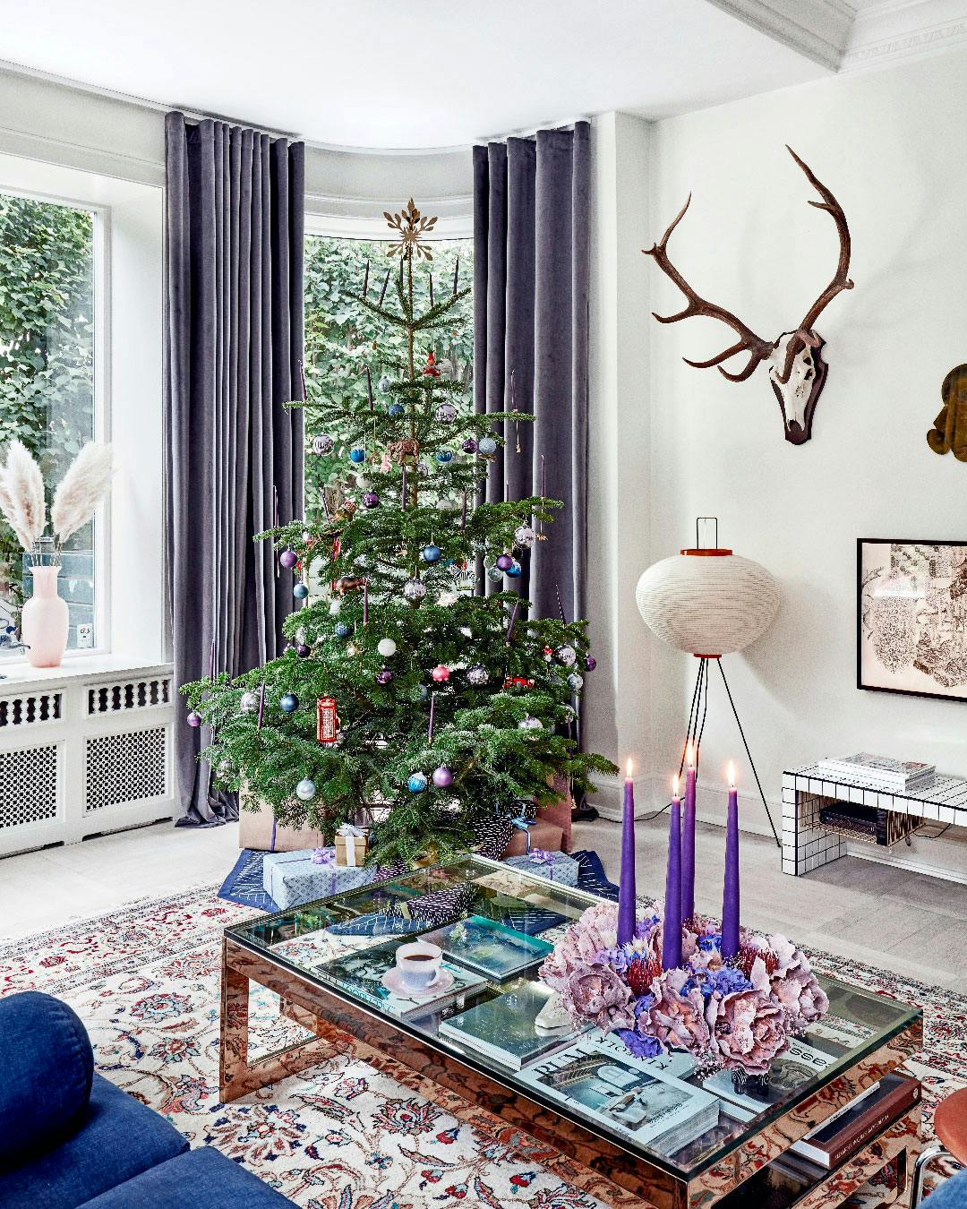 Modige farver gør julen moderne, selvom både træ og adventskrans er klassiske elementer. På træet hænger kugler fra Øster Skovgård Julehandel, Anne Blacks Sighs. Rislampen er designet af Isamu Noguchi for Vitra, Belgo Chrome-bordet er fundet på Bukowskis Auktionshus, og gardinerne er fra &Drape.