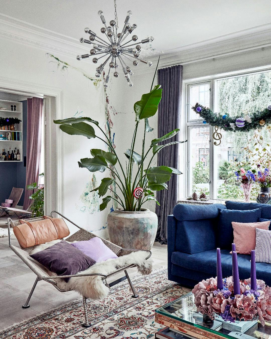 En stor guirlande i vinduet er en finurlig måde at give julestemning på. De store bolsjer er ligesom guirlanden fra Hofflands. Adventskransen er fra Bike & Bloom. Flaglinestolen fundet på DBA er fra PP Møbler, og gulvtæppet er et arvestykke. Den store plante, sydafrikansk strelitzia, fra Greenify er i en krukke fra Rabens Saloner.