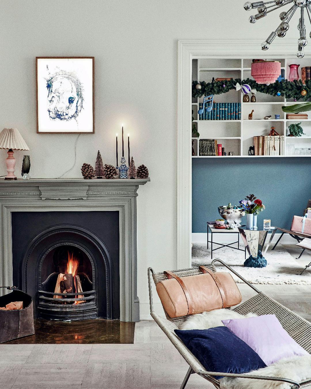 Tænk også på resten af tilbehøret såsom puder, stearinlys, blomster og vaser, hvis du vil lege med farverne. Puderne i Flaglinestolen er fra Camille Helene. Over pejsen hænger en lysinstallation fra Kuvio med et kunstværk af Thomas Sionnach.