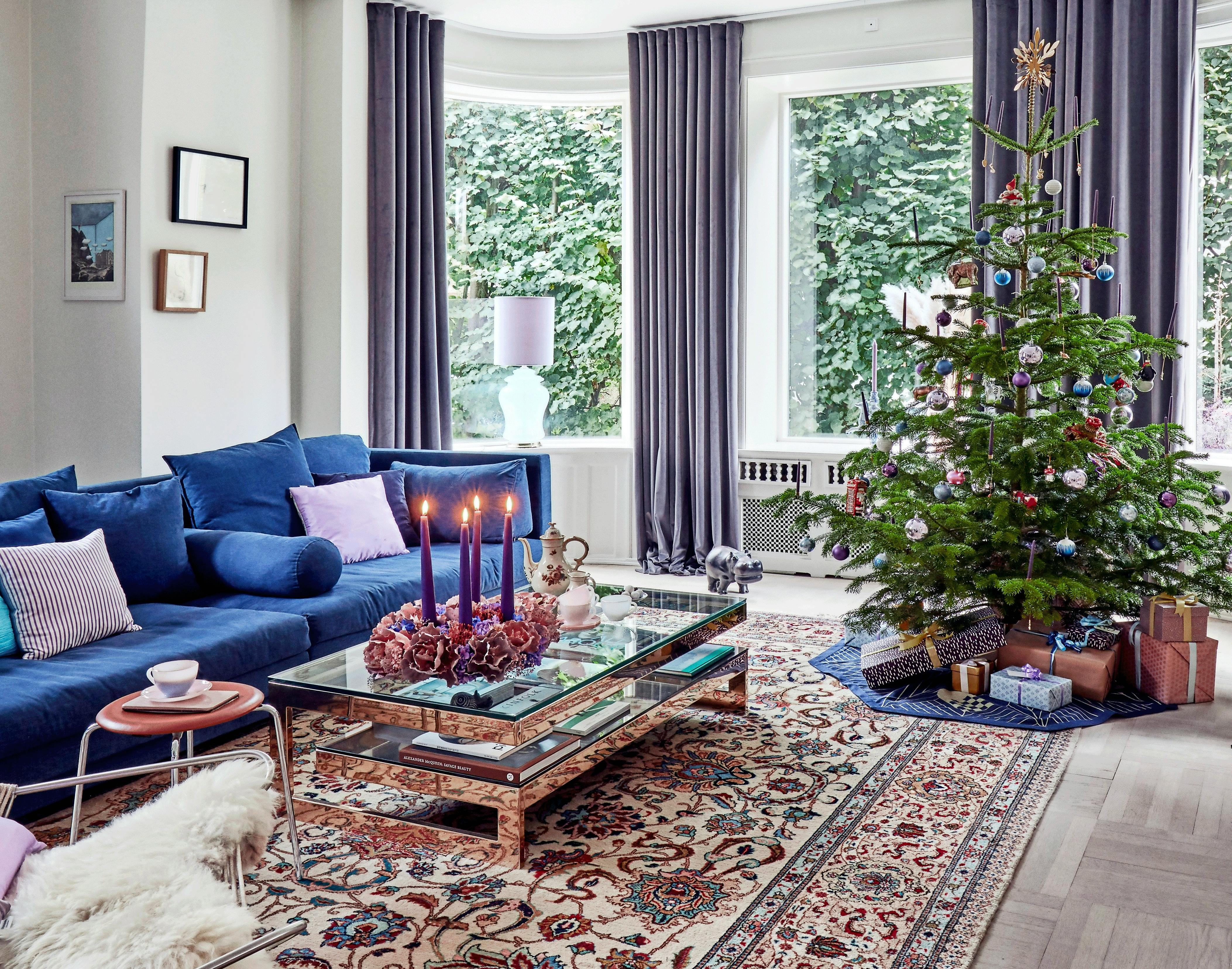 De utraditionelle blålilla nuancer er i år gennemgående både som julepynt og i dekorationer.