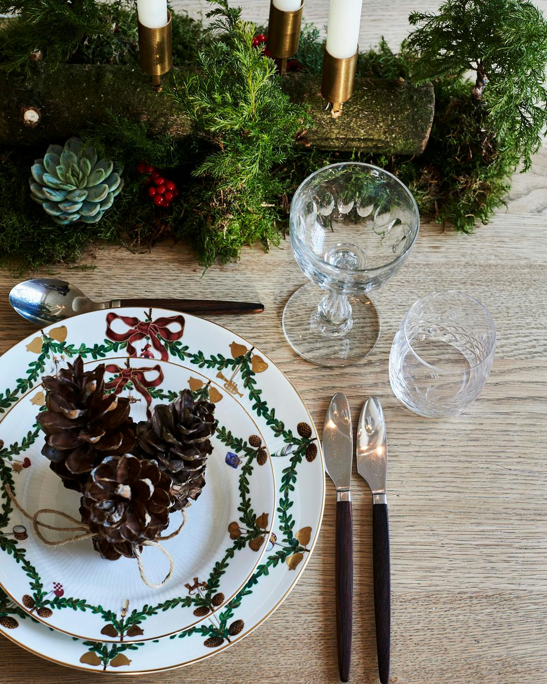 Julebordet, der er holdt i simpel nordisk stil, er dækket med det klassiske julestel, Stjerne Riflet Jul fra Royal Copenhagen, som Christina hvert år finder frem fra gemmerne. Vinglassene er gamle franske glas fra Labrocante, bestikket med palisanderskaft er fra Raadvad og servietterne er fra Lovely Linen.
