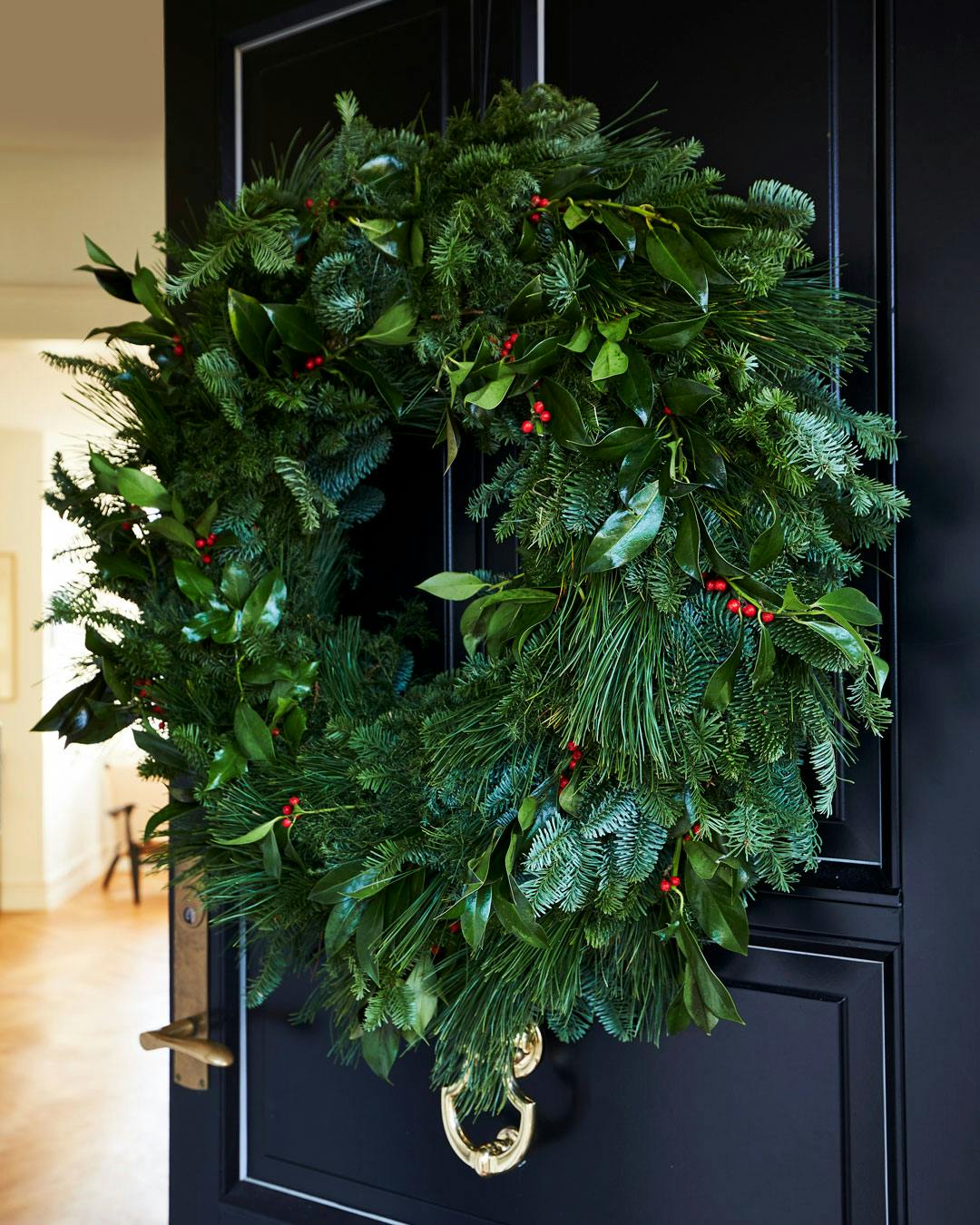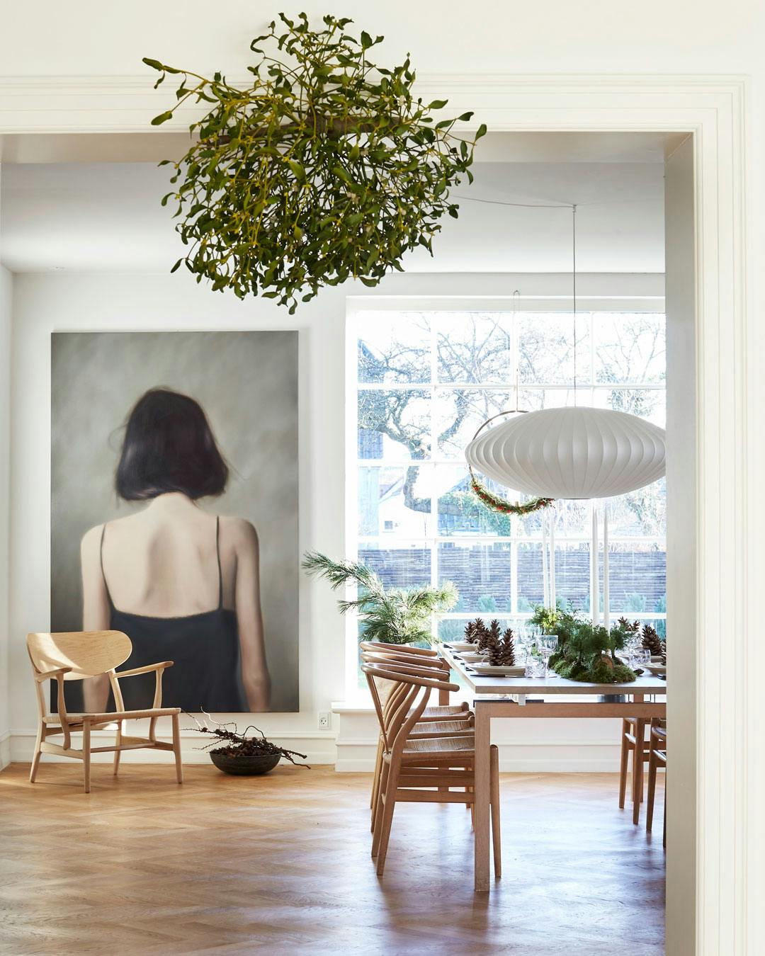Misteltenen er fredet i Danmark, og derfor er dem, man kan købe hos blomsterhandleren i december, ofte importeret. Har du en stor døråbning mellem f.eks. stue og køkken, kan en fyldig kvist være en nem og dekorativ måde at forbinde de to rum. Maleriet i baggrunden er af Siri Grindesgaard, og loungestolen er designet af Hans J. Wegner.
