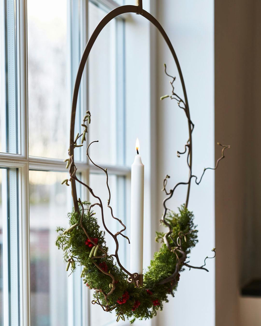 Er dit hjem udstyret med store vinduespartier, kan du udnytte det ved at hænge en krans, som du kan gemme år efter år og dekorere forskelligt, så den matcher den øvrige pynt. Kransen i messing er fra Nordal.