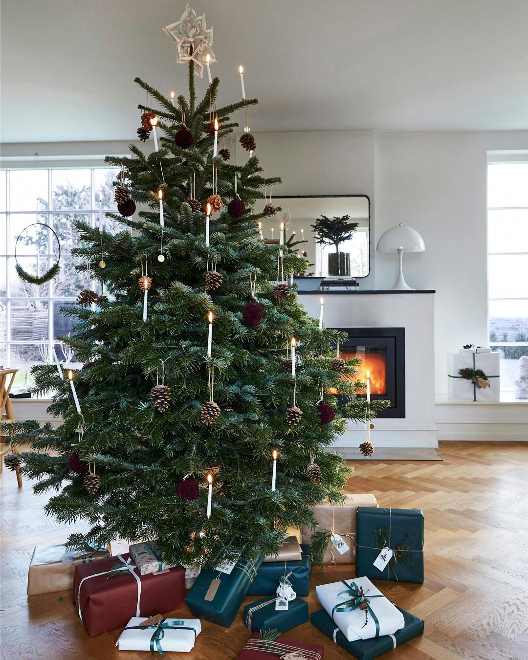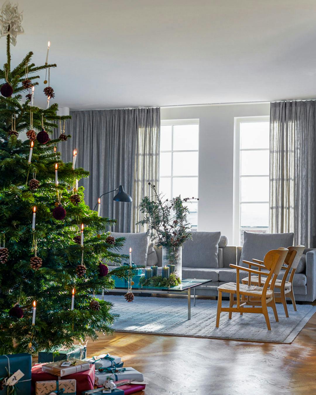 Lad dine indpakkede julegaver være en del af indretningen, og vælg indpakningspapir og bånd, der komplimenterer den øvrige pynt. Koglerne på træet er håndlavede og fra Bertelsen Blomster, lysholderne er fra Ferm Living og julekuglerne i glas med ruskind fra Nordal.