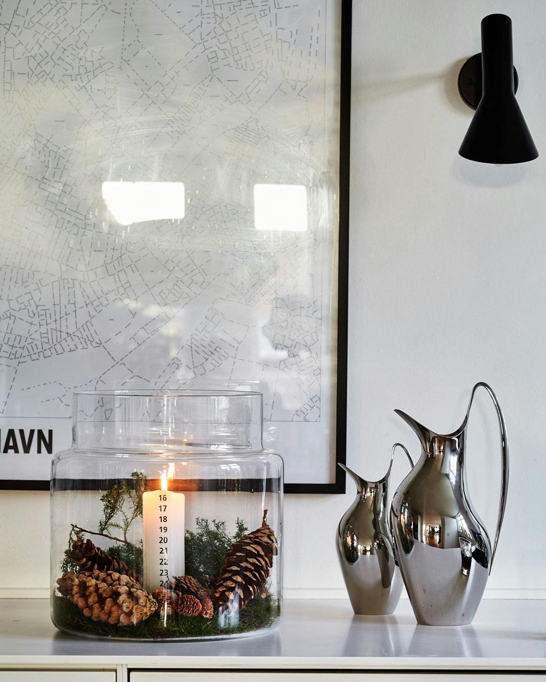 Nedtællingen til juleaften er en gammel skik, som kom længe før det første kalenderlys, der blev produceret af Asp-Holmblad i 1942. Du kan vælge at holde dekorationen omkring kalenderlyset simpel, som her hvor lyset er placeret i en stor glasvase og dekoreret med enebær. Dekorationen er af Per Ulmer fra Bertelsen Blomster, væglampen er designet af Arne Jacobsen, og kanderne er fra Georg Jensen.