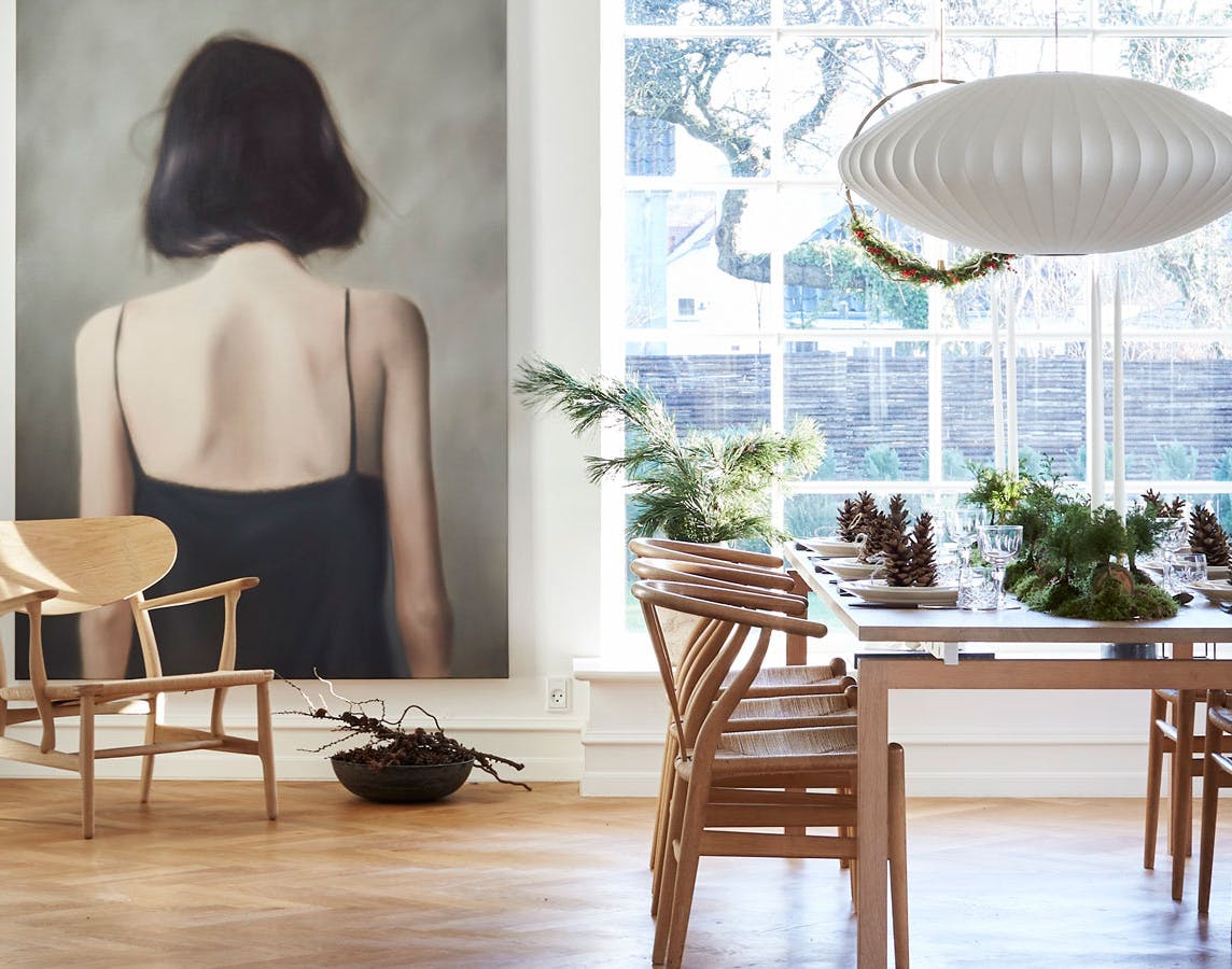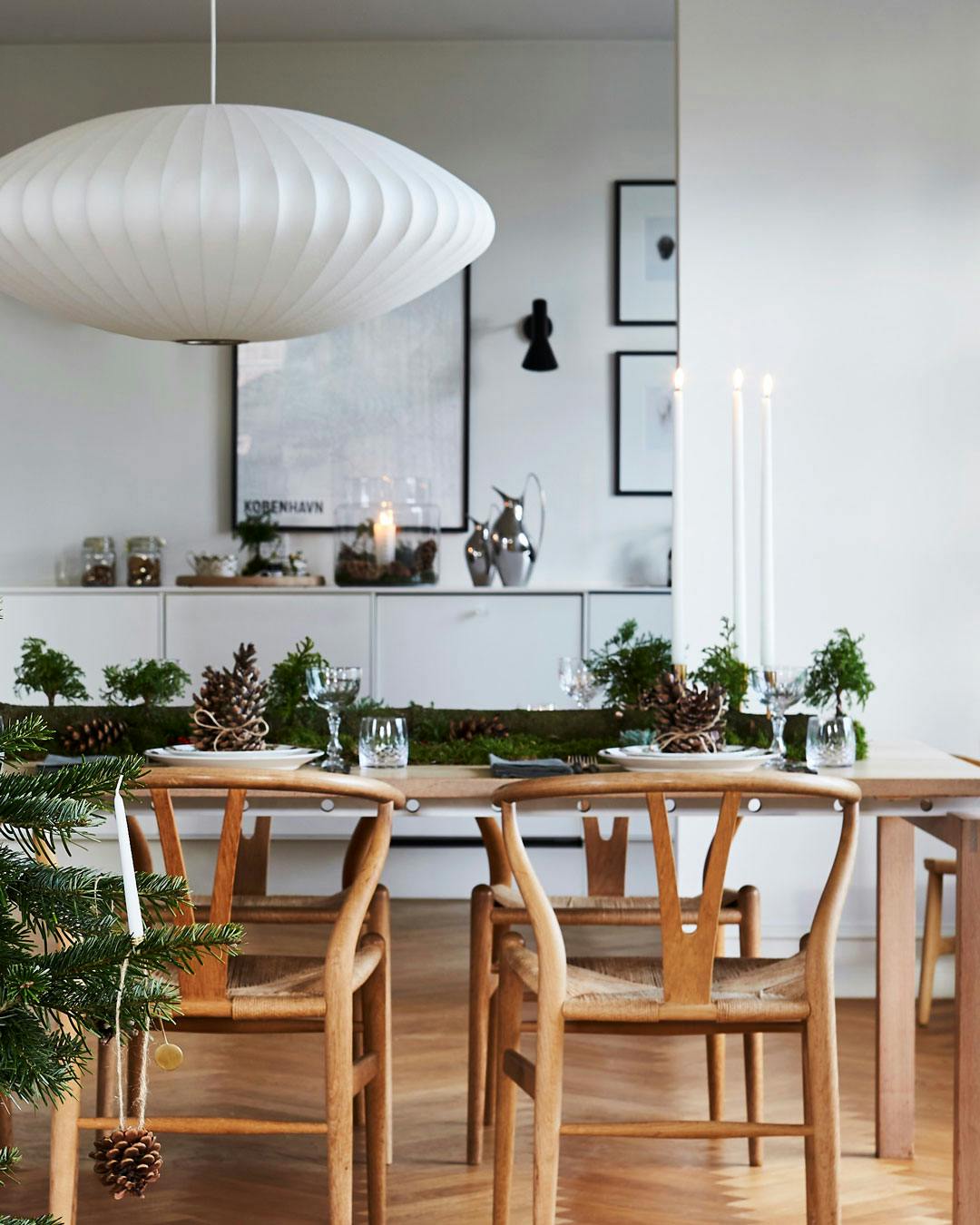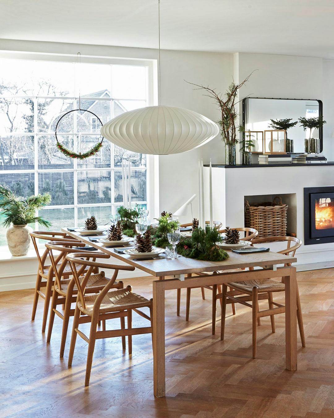 Har du kig gennem flere rum, så sørg for, at der er sammenhæng mellem julepynten på tværs af rummene, så udtrykket ikke bliver rodet. Bordet er designet af Christina Strand og Y-stolene er designet af Hans J. Wegner.