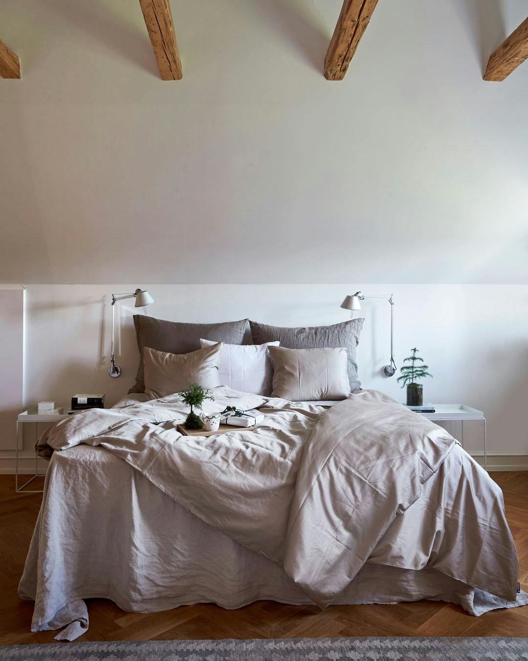 Hold pynten i soveværelset til et minimum, og nøjes i stedet med at tilføje enkelte elementer som f.eks. et lille grantræ eller en simpel julekugle. Lamperne er fra Ingvardt Christensen og designet af Artemide, sengetøjet er fra Hästens, og de store puder er fra Roomers.