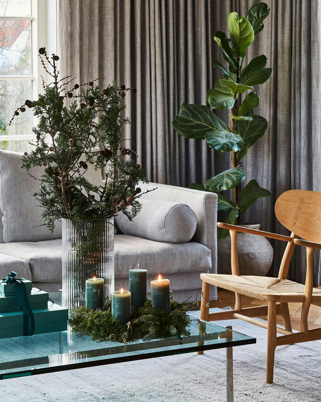 På sofabordet, der er designet af Poul Kjærholm, står en adventskrans af blød enebær, gran og troldhassel bundet af Lars Bertelsen fra Bertelsen Blomster. En høj vase med koglegrene tilføjer lidt højde til det julede stilleben. De blå gaveæsker er fra Stefan Papir i Oslo, og gavebåndet er fra Bungalow.