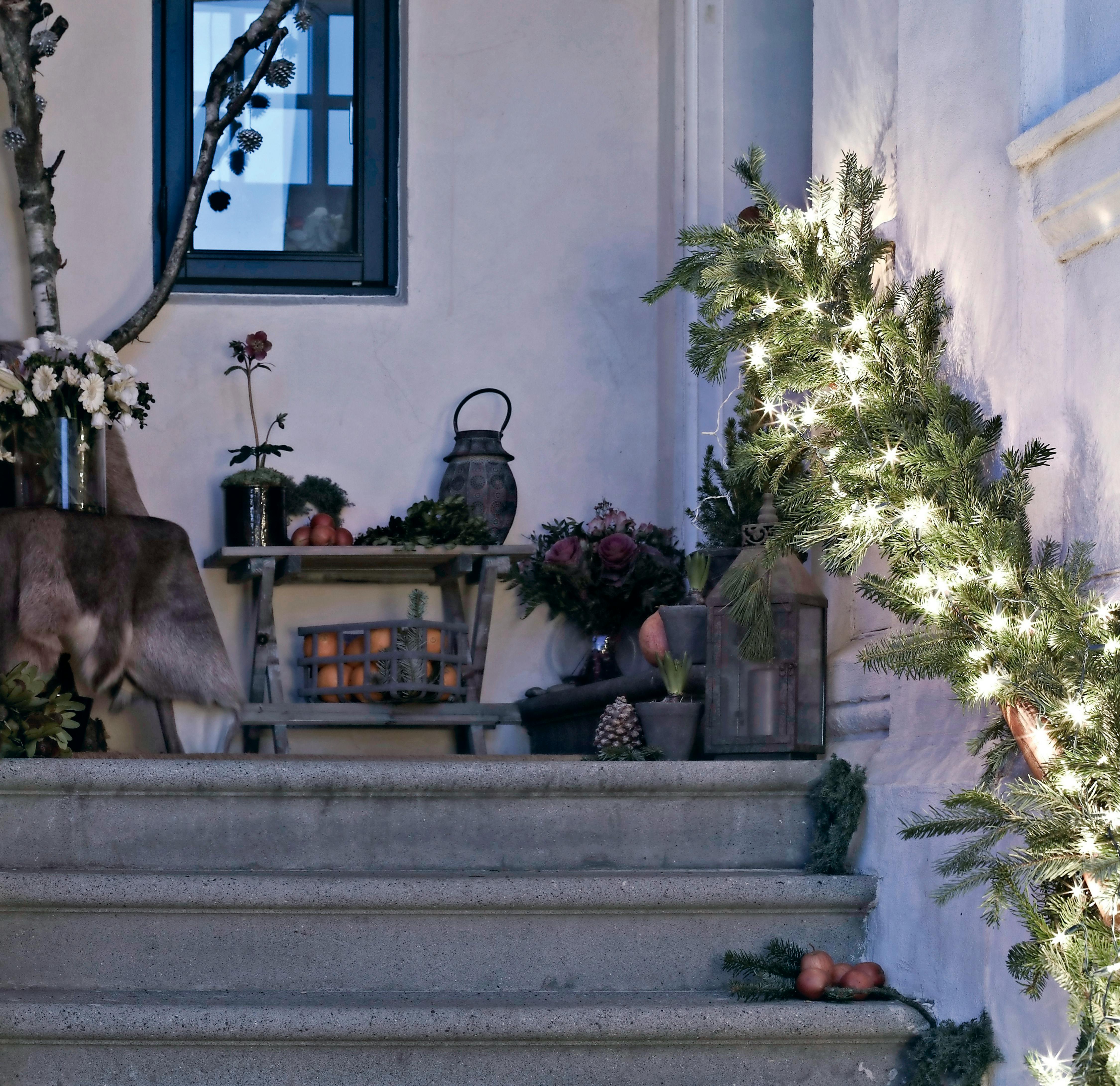 Gæsterne bliver budt velkommen ved husets smukke indgangsparti af et overdådigt tableau af friske blomster, grønne grene, modne appelsiner og en snoet granranke og en lyskæde om gelænderet.