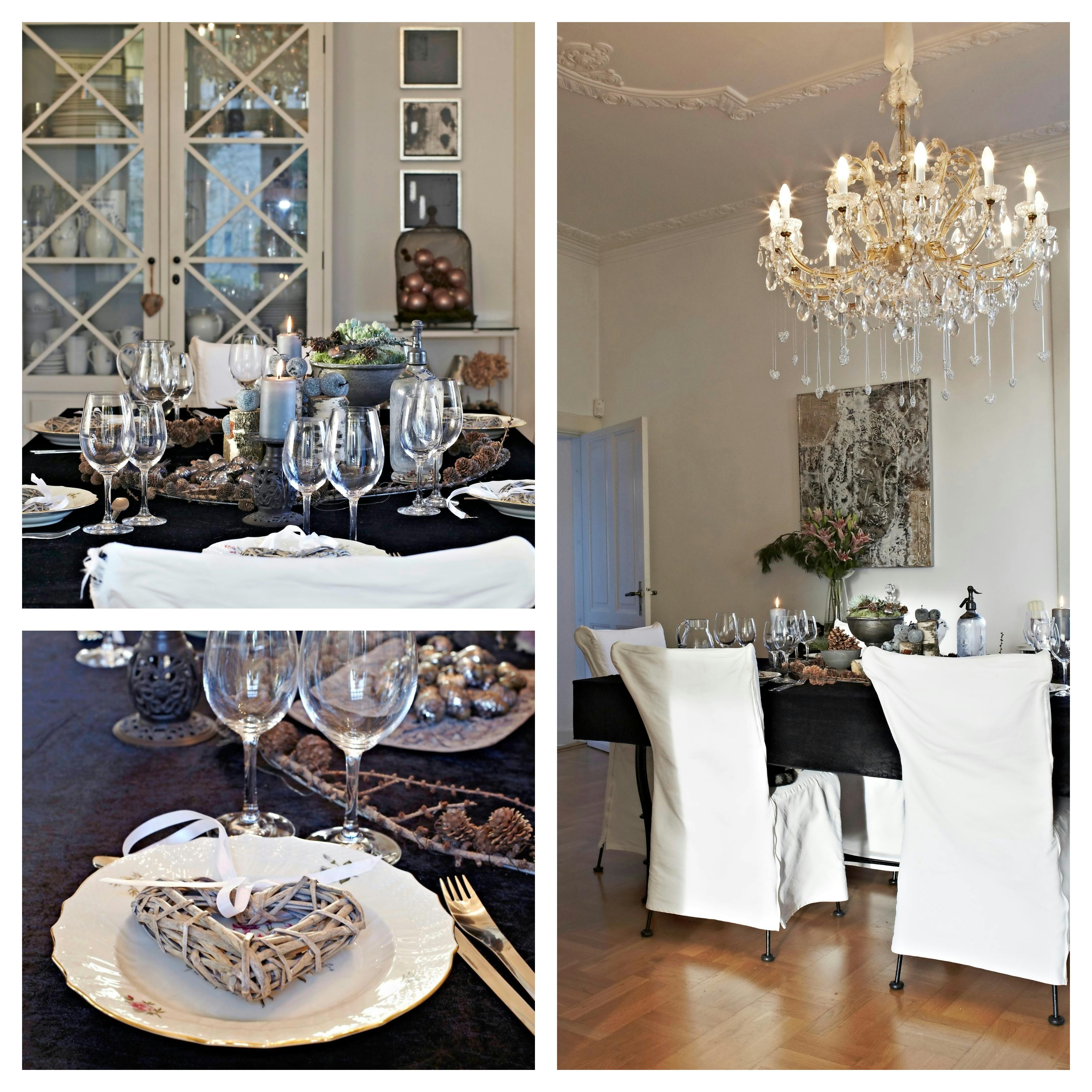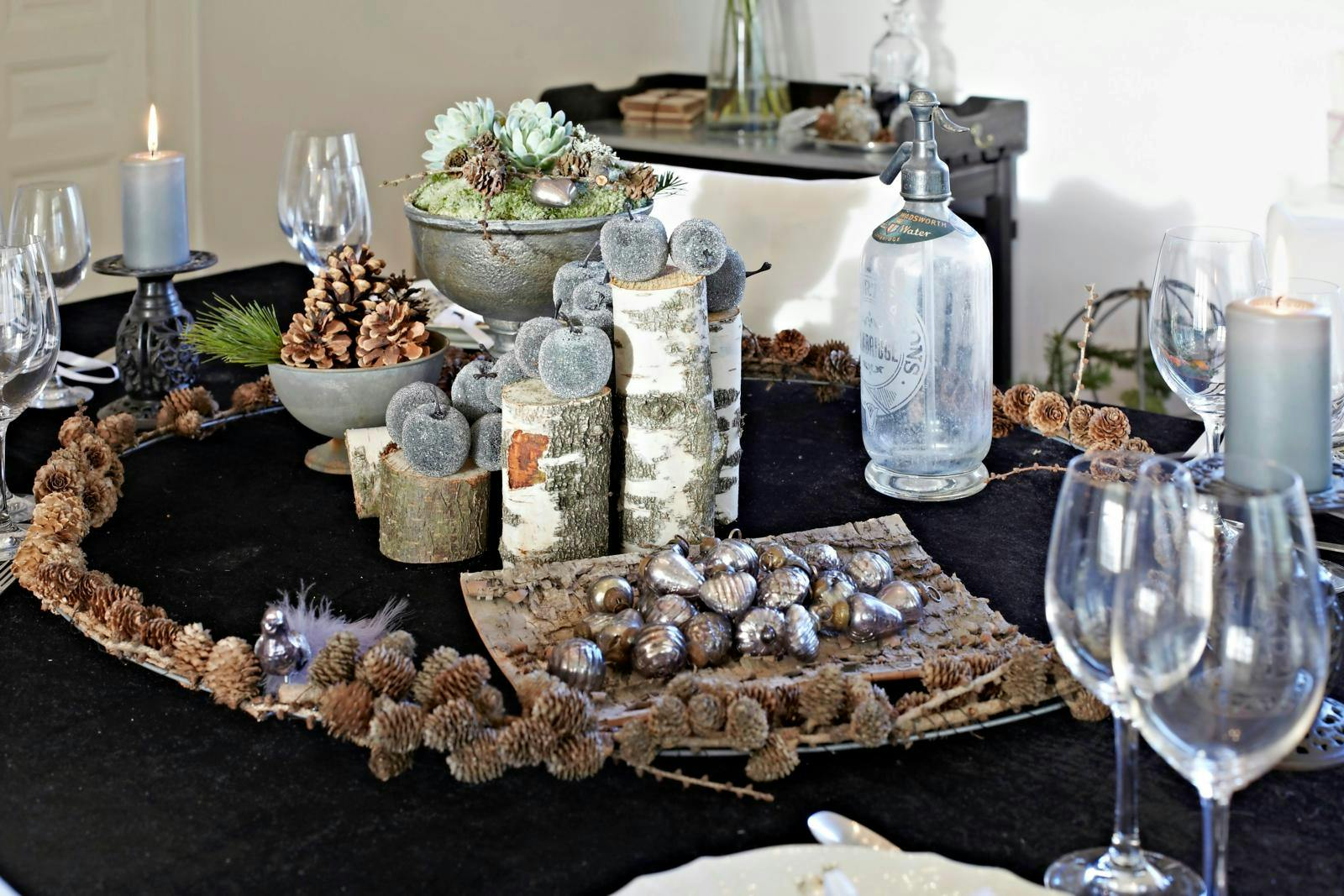 Marianne finder først og fremmest inspiration til sine dekorationer i naturen, hvor hun samler kogler, kviste, lærkegrene og små bark- og birkestykker. Julebordet er aldrig dækket kedeligt op! Her bliver der pyntet med et mix af naturpynt og sølvornamenter.
