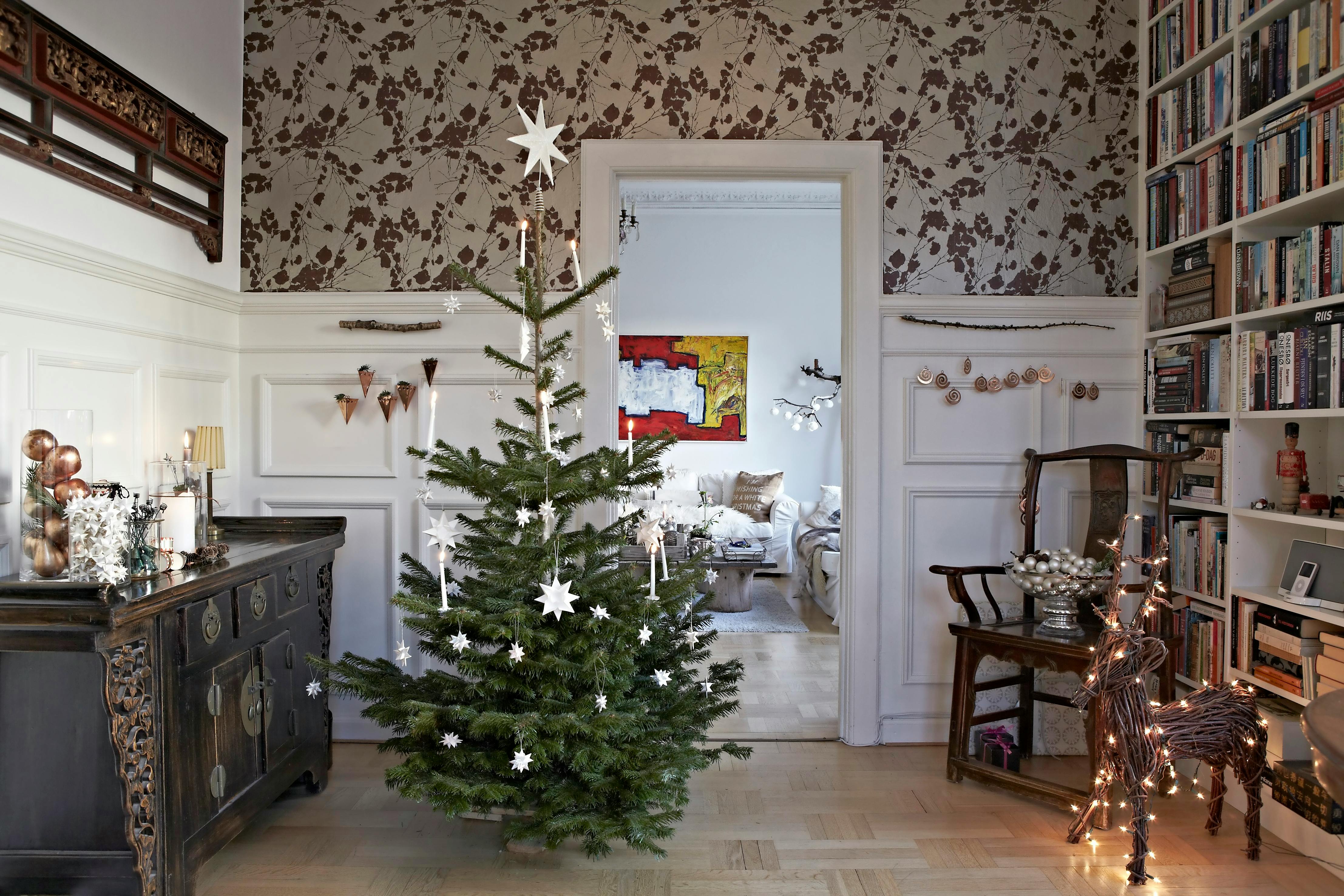 Den midterste af husets tre stuer er indrettet som bibliotek og er holdt i lidt mørkere toner. Det er her, familiens juletræ står. I år er det pyntet med papirstjerner, som Mariannes svigerfar har lavet.