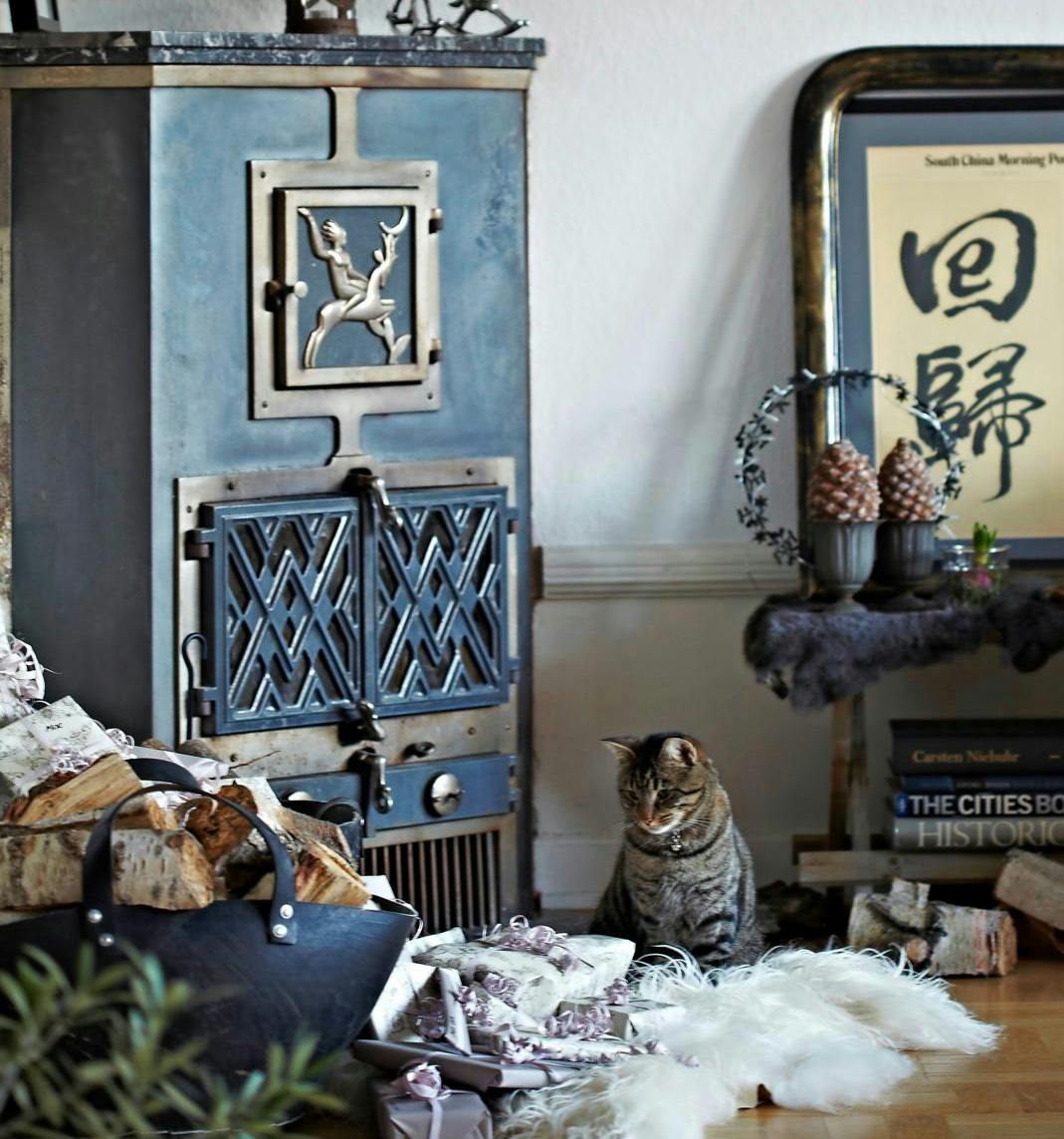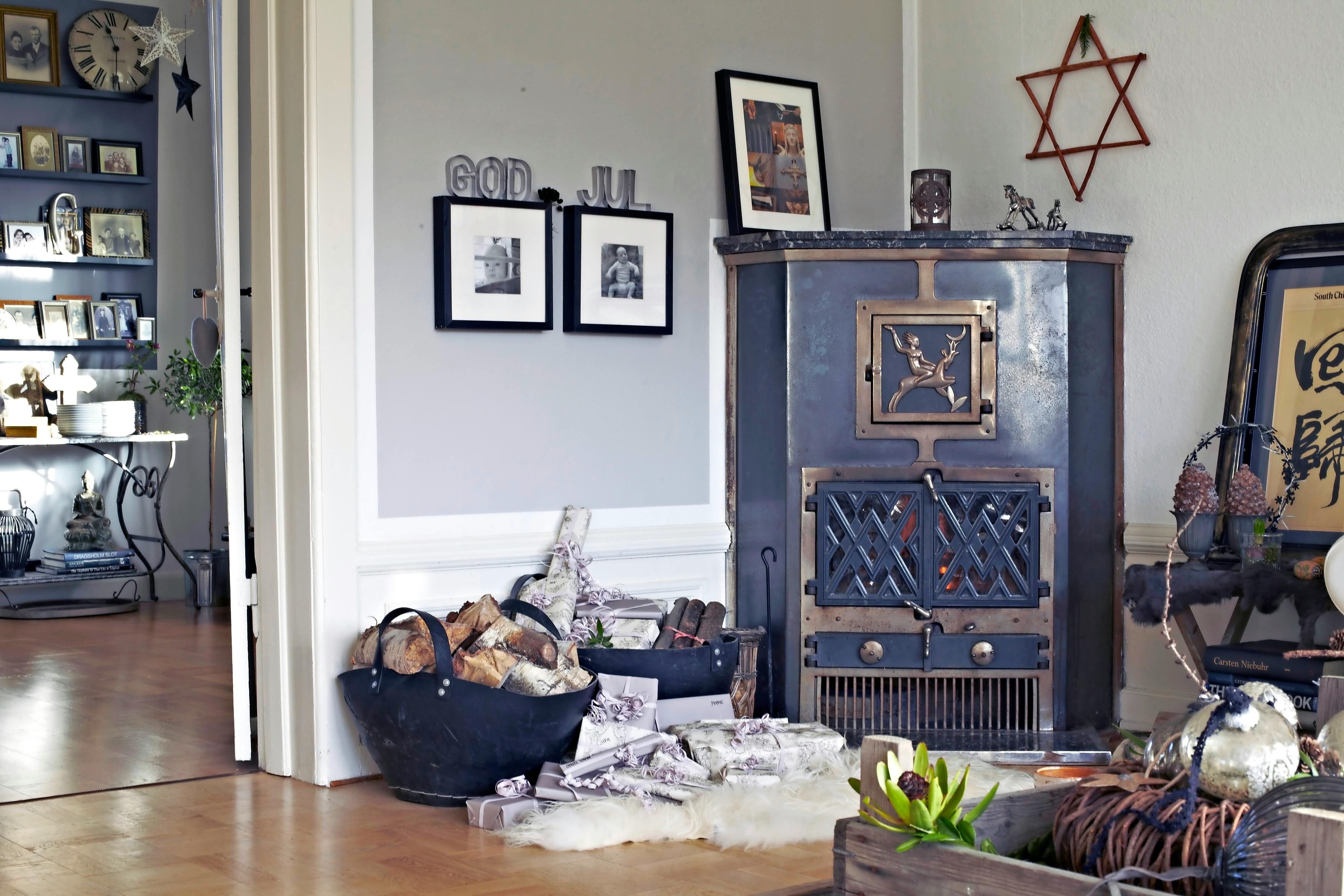 Den midsterste af husets tre stuer kaldes for pejsestuen, da den smukke, gamle hjørnekakkelovn er rummets hjerte. Stuen er skabt til mange mennesker, og familien elsker at fylde den op med gæster, særligt på de mørke decemberaftener.