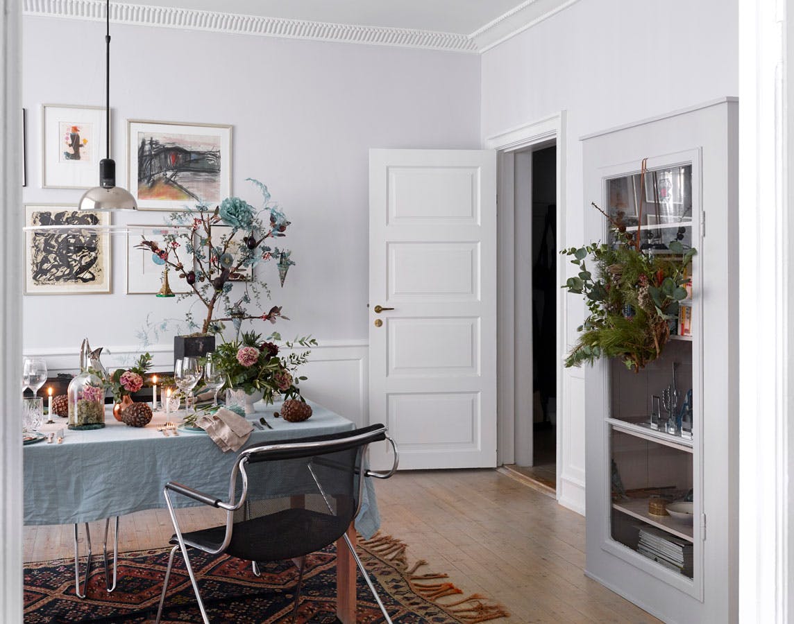 Ved at vælge grene og kranse som en del af juleoppyntningen, får du nemt og elegant naturen ind i boligen. Suppler med vaser i forskellige højder og drøjder, og du får det fineste julebord. Spisebordet her er hjemmelavet, og stolen er Penelope fra Catelli. Pendlen er fra Flos.