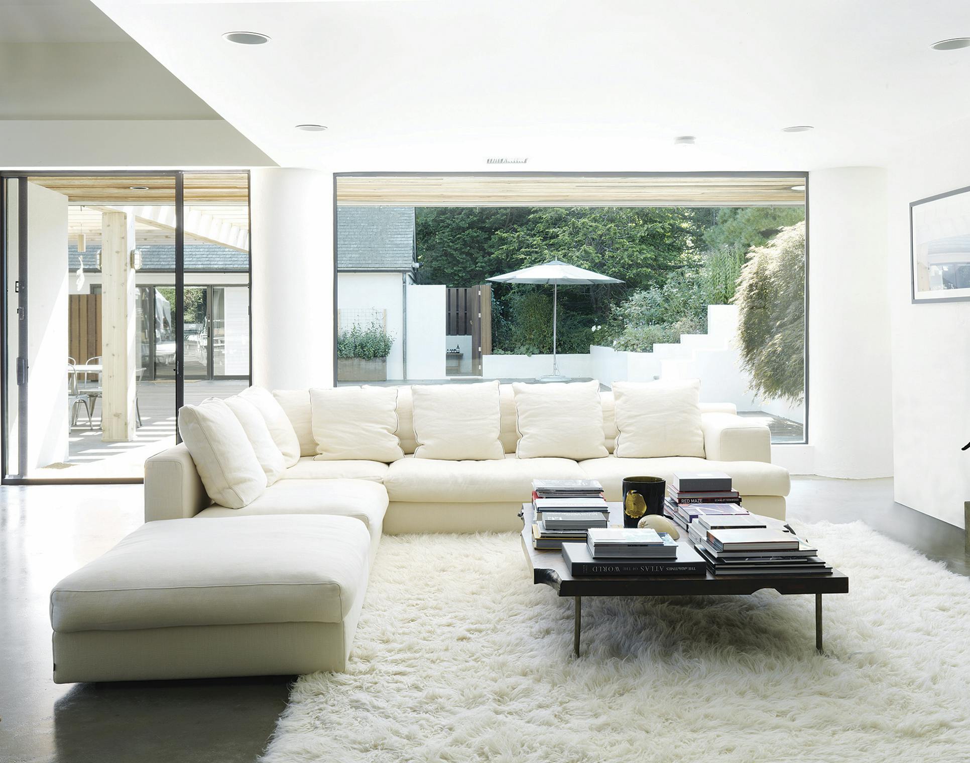 I modsætning til et skræddersyet køkken valgte familien Wainwright allerede eksisterende køkkenmoduler fra Vipp leveret som færdige produkter og designet ned til den mindste detalje – selv vandhane, greb, skuffeindsatse og den fire millimeter tykke bordplade i rustfrit stål er designet af Vipp. En vindeltrappe i stål og træ leder op til soveværelserne på anden etage og står i fin kontrast til det meget lyse køkkenområde. Fra hylder over køkkenvasken liver et udvalg af keramik med bløde former og farverige glas op i det hvide køkken. De store gulv til loft-vinduer inviterer farver indenfor og danner ramme om de vidtvoksende blade og grene på den anden side af glasset. På den måde spiller naturen en fremtrædende rolle i interiøret.