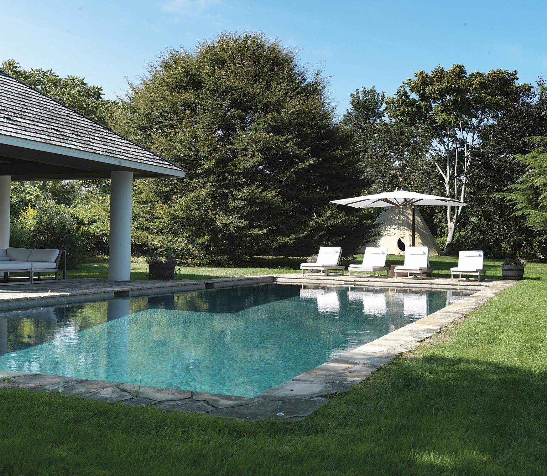 I løbet af sommeren udfolder Hamptons-huset sit fulde potentiale som refugium for familien. Loungen og udekøkkenet skaber en lille oase i naturen. De to etager er omgivet og næsten skjult af vidtløftige buske, grønne underlag og en håndfuld forskellige træsorter. Det store udendørsområde omfatter også en udendørsbruser, et anneks til gæster, en swimmingpool og en 20-personers tipi med bålplads.