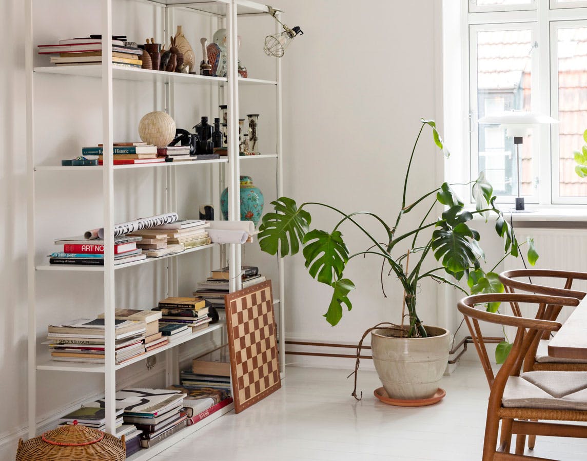 Planter understøtter det naturlige i indretningen. Her skaber en stor monstera på gulvet samspil mellem farverne på reolen og Y-stolene i naturtræ. Reolen er fra Ikea, og indholdet er et mix af loppefund og ferieminder.