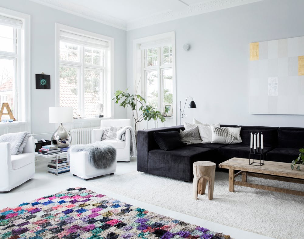 Nogle skønne farverige tæpper afslører, at hun netop har været i Marokko. Tæpperne pynter både i stuen og soveværelset, hvor det jo også kan nydes af dem, der sidder ved spisebordet.