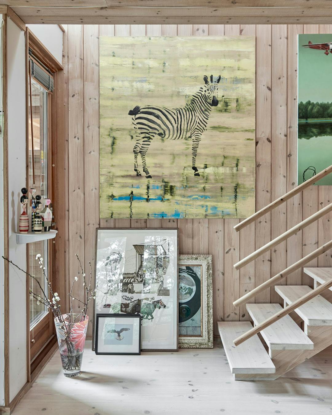 Forskelligt kunst hænger på væggen ved trappen, men på gulvet står der også et udvalg lidt tilfældigt, og det giver et mindre stringent look.