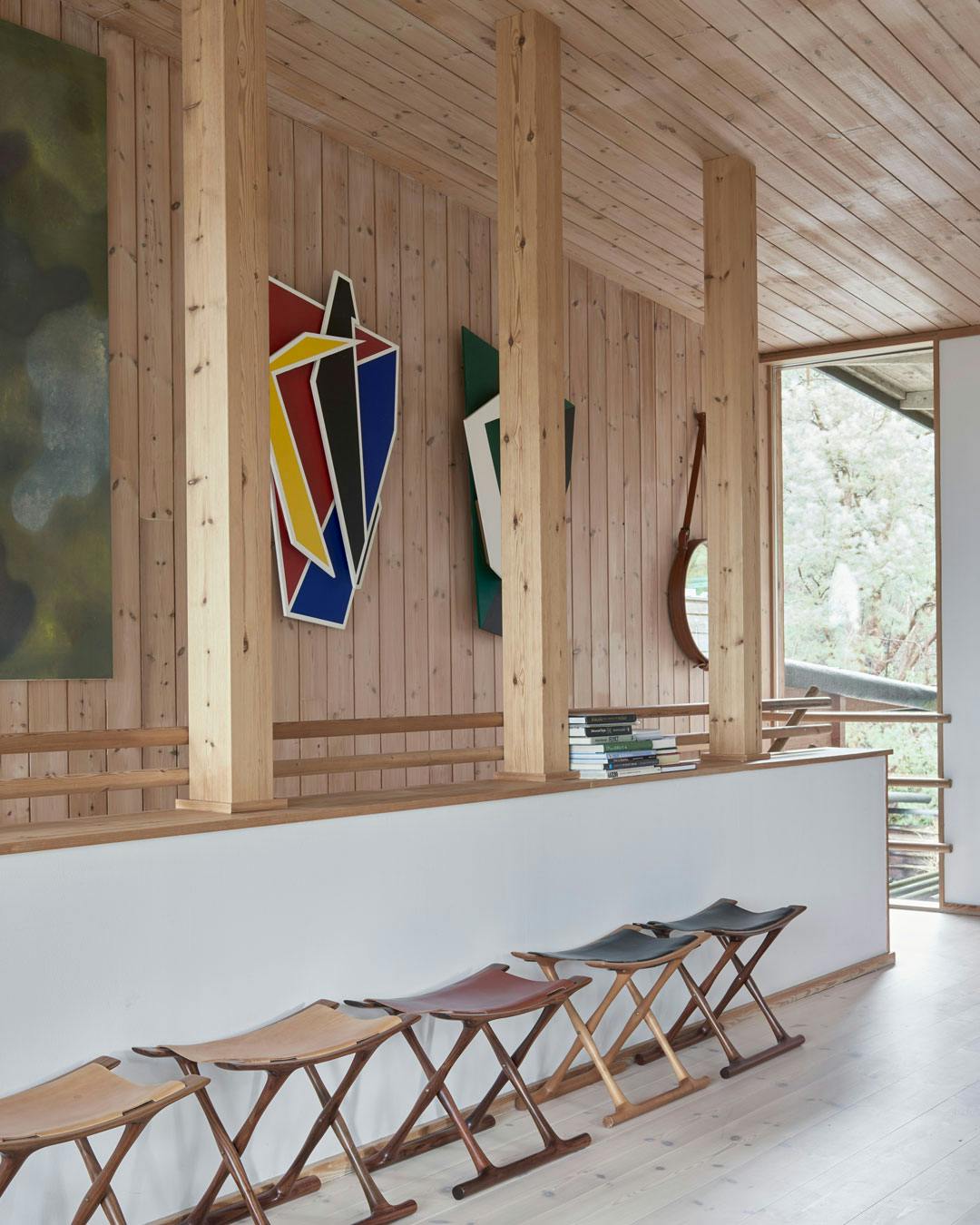 Forskellige træsorter og jordfarver er gennemgående i villaen for at skabe den naturlige forbindelse, mens lyse egetræsmøbler skal give følelsen af sommerhus, når det er sommer.