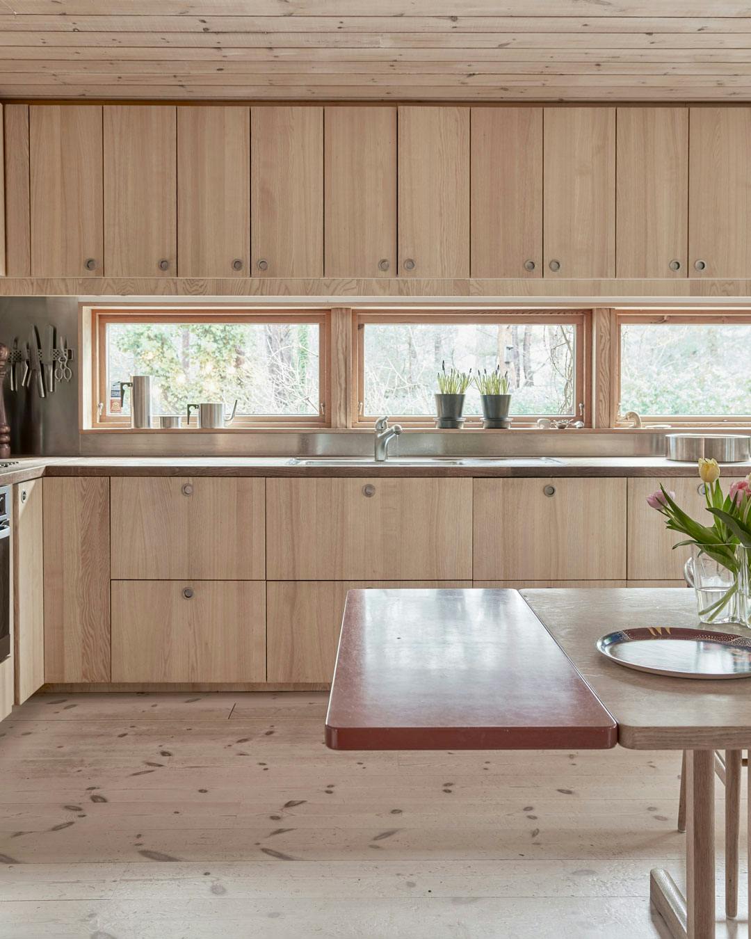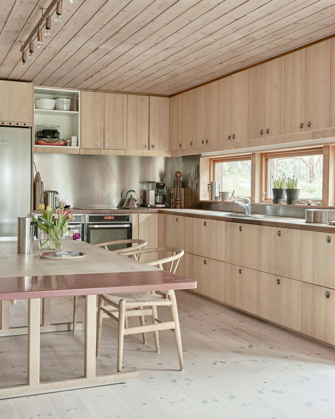 Både gulv, loft, køkkenfronter og spisebordet er i lyst træ, og for at bryde det er der sat en plade i bordet i en anden nuance. Det giver modspil og kant.