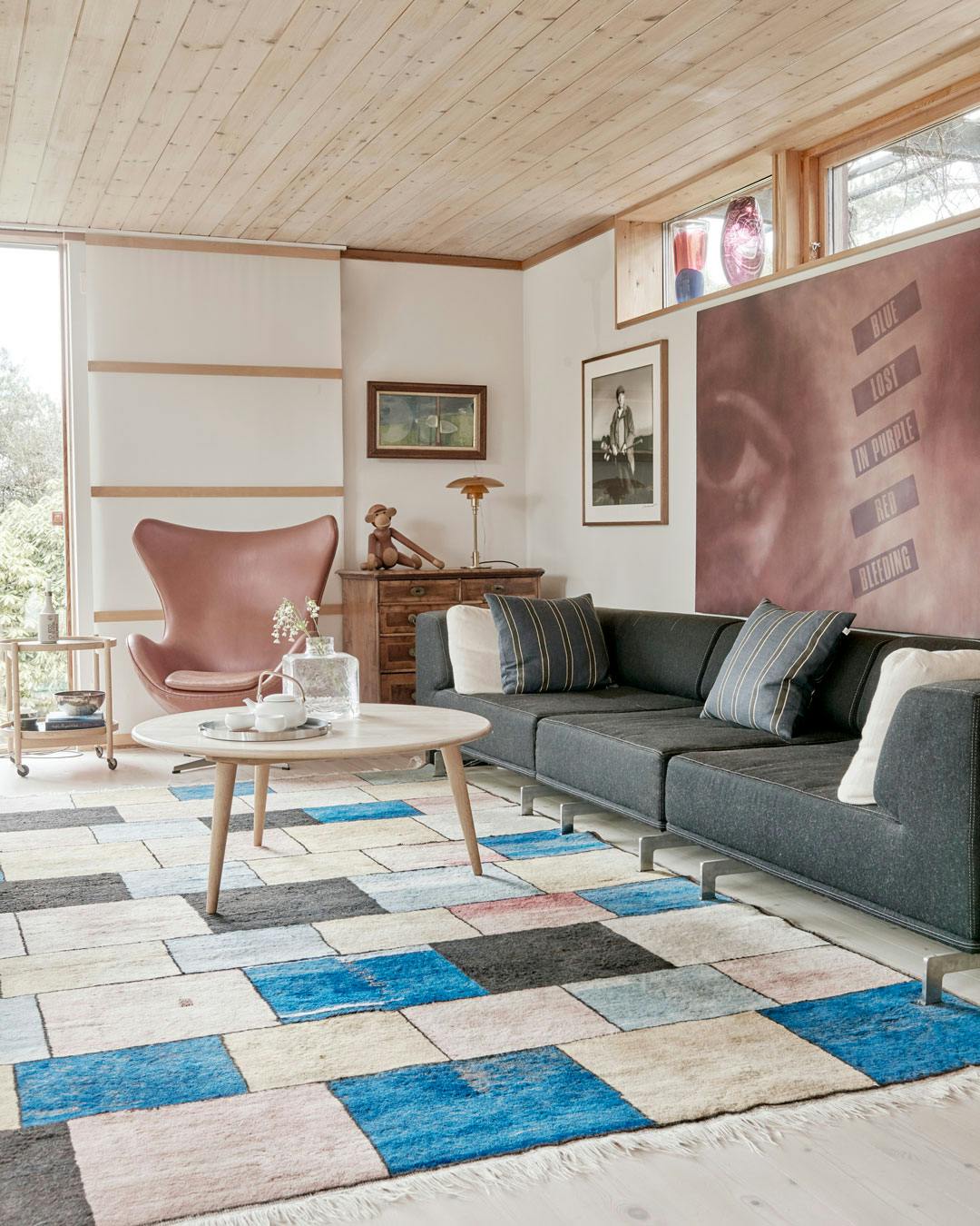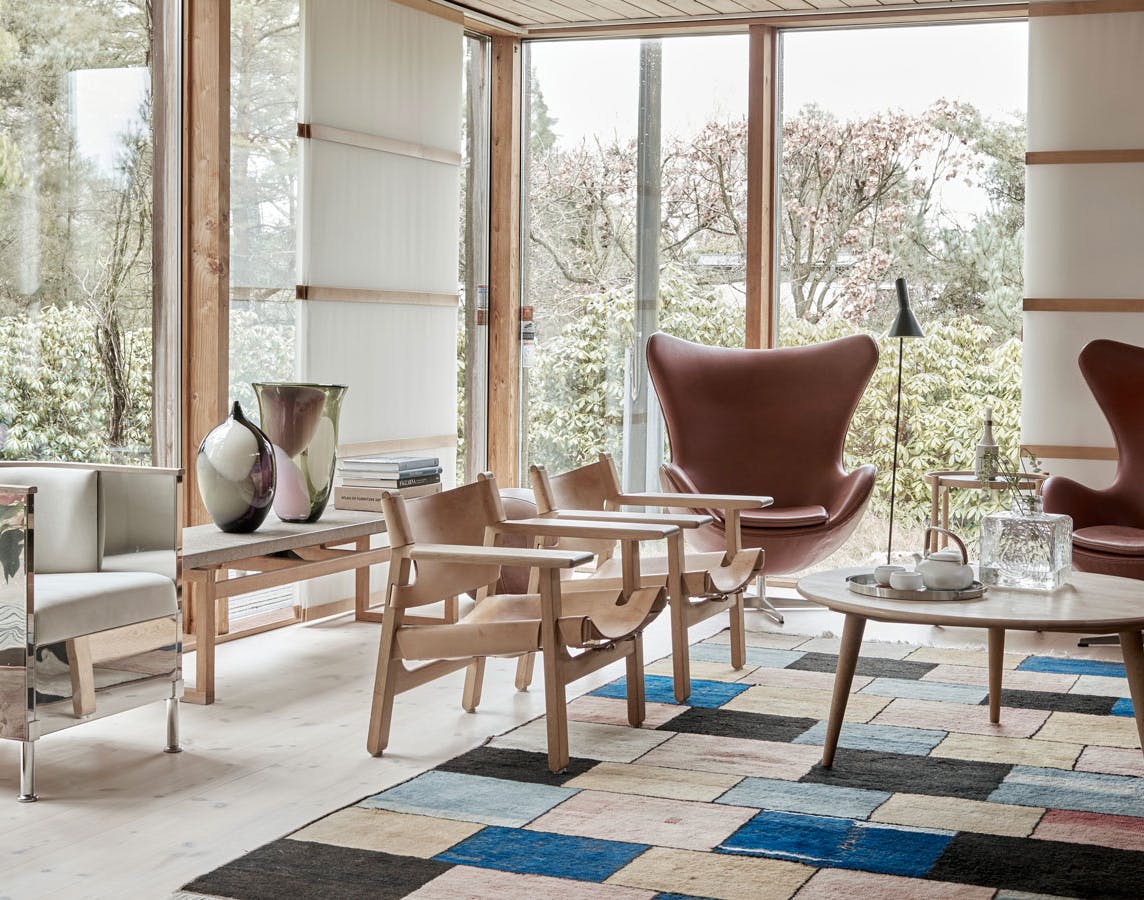 Store og lyse rum kan gøres mere varme med et stort gulvtæppe, fordi det giver noget stoflighed til rummet. I stuen står Arne Jacobsens æg med Børge Mogensens Spanske Stol.