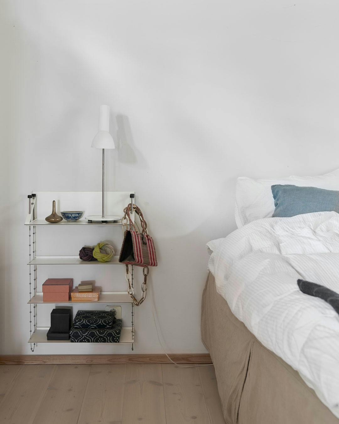 I soveværelset hænger en version af String Furnitures hylder ved siden af sengen og fungerer som natbord, hvor der er plads til lidt ekstra.