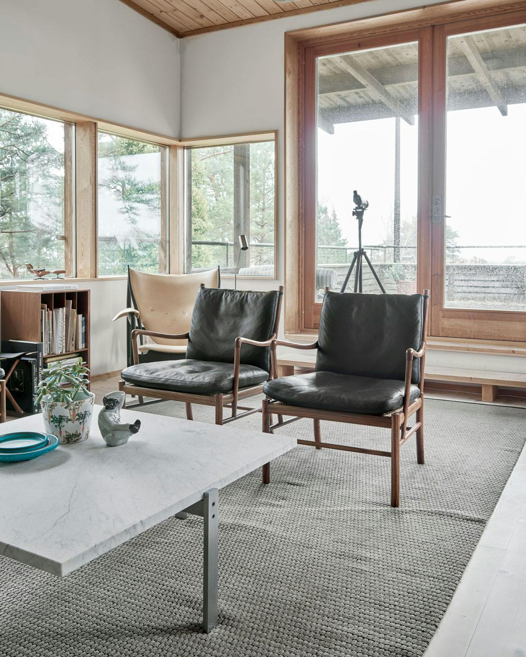 Gentagelse gør godt, og møbler tæt på hinanden indbyder til samtale. I stuen på første sal er et marmorbord af Poul Kjærholm centrum. Ved det står to Colonial Chair-stole designet af Ole Wancher.