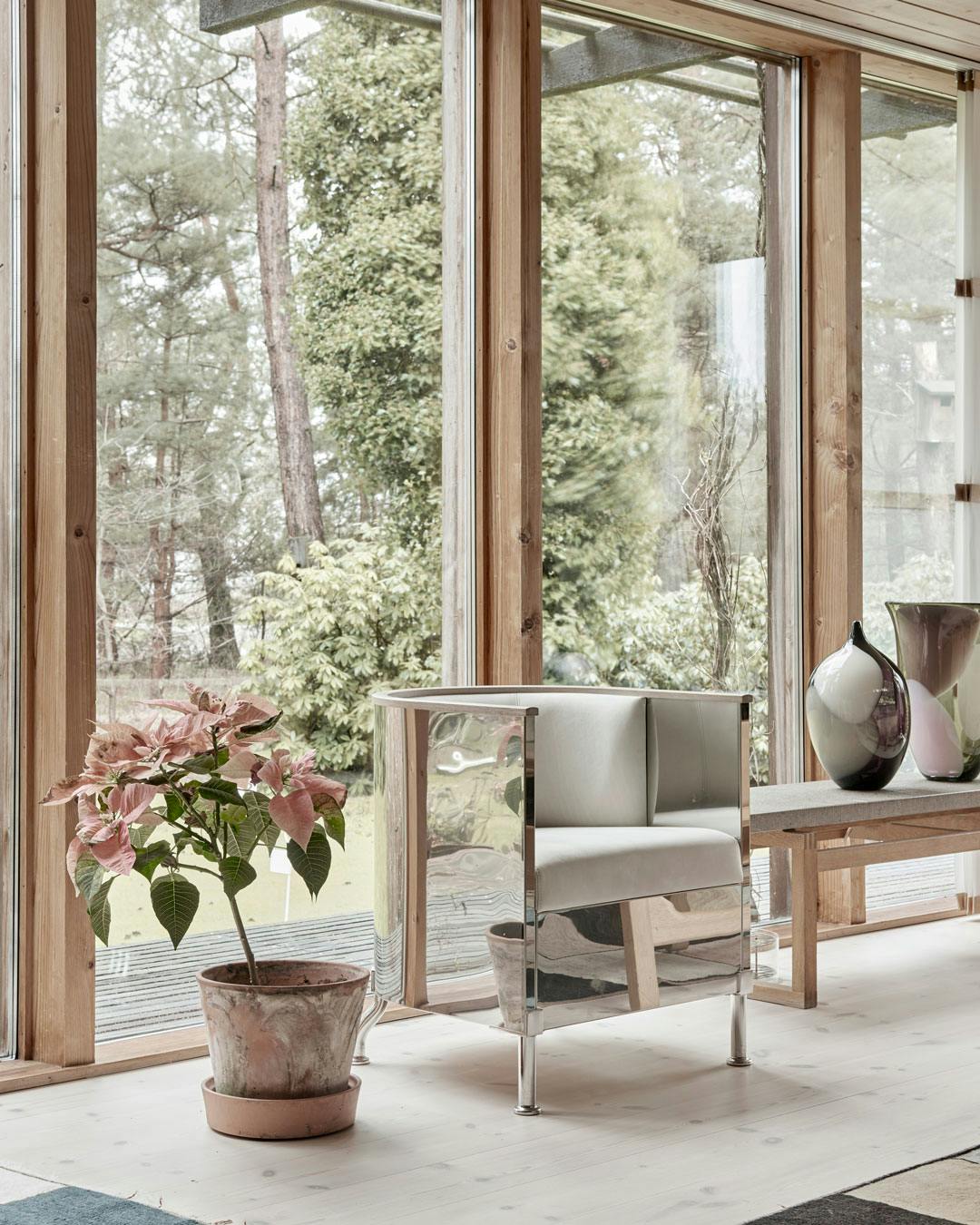 – Jeg kunne for eksempel aldrig finde på at bruge plexiglas i indretningen, fordi det ikke går i spænd med det naturlige, og det er vigtigt for mig, at der er en forbindelse mellem boligens indretning og den omkringliggende natur. Der må ikke være en markant kontrast, siger Peter Erlandsson.