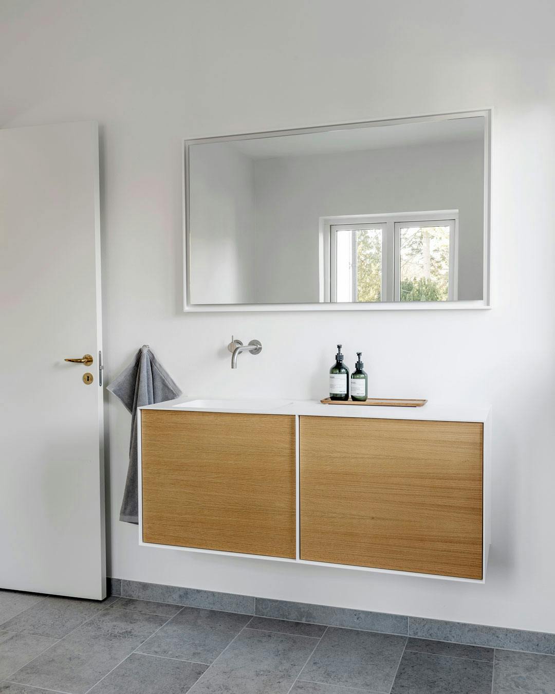 De hvide og grå flader og det olierede egetræ går igen på badeværelset og skaber sammenhæng mellem husets rum. Bademøblerne er fra Copenhagen Bath med specialdesignede fronter fra Handcrafted Interior. Armaturet er fra Vola, og fliserne fra Fired Earth.