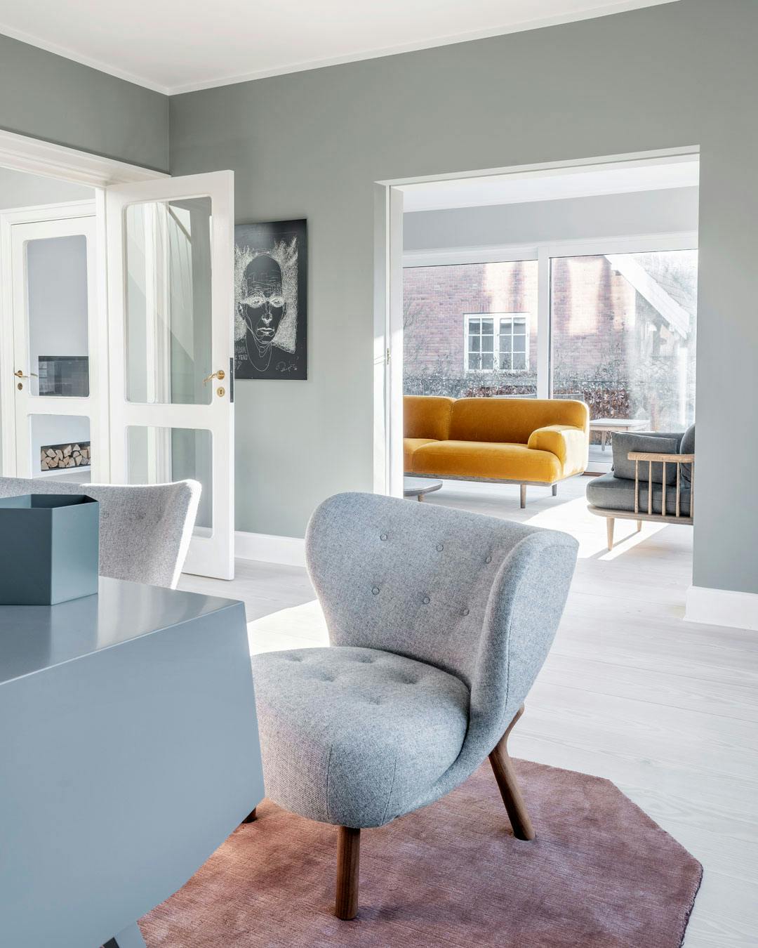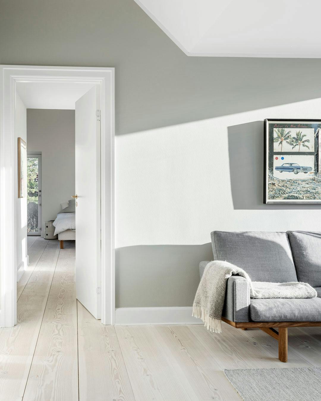De hvide karme og den hvide dør fungerer som en elegant overgang mellem den grå tv-stue og det hvide soveværelse.