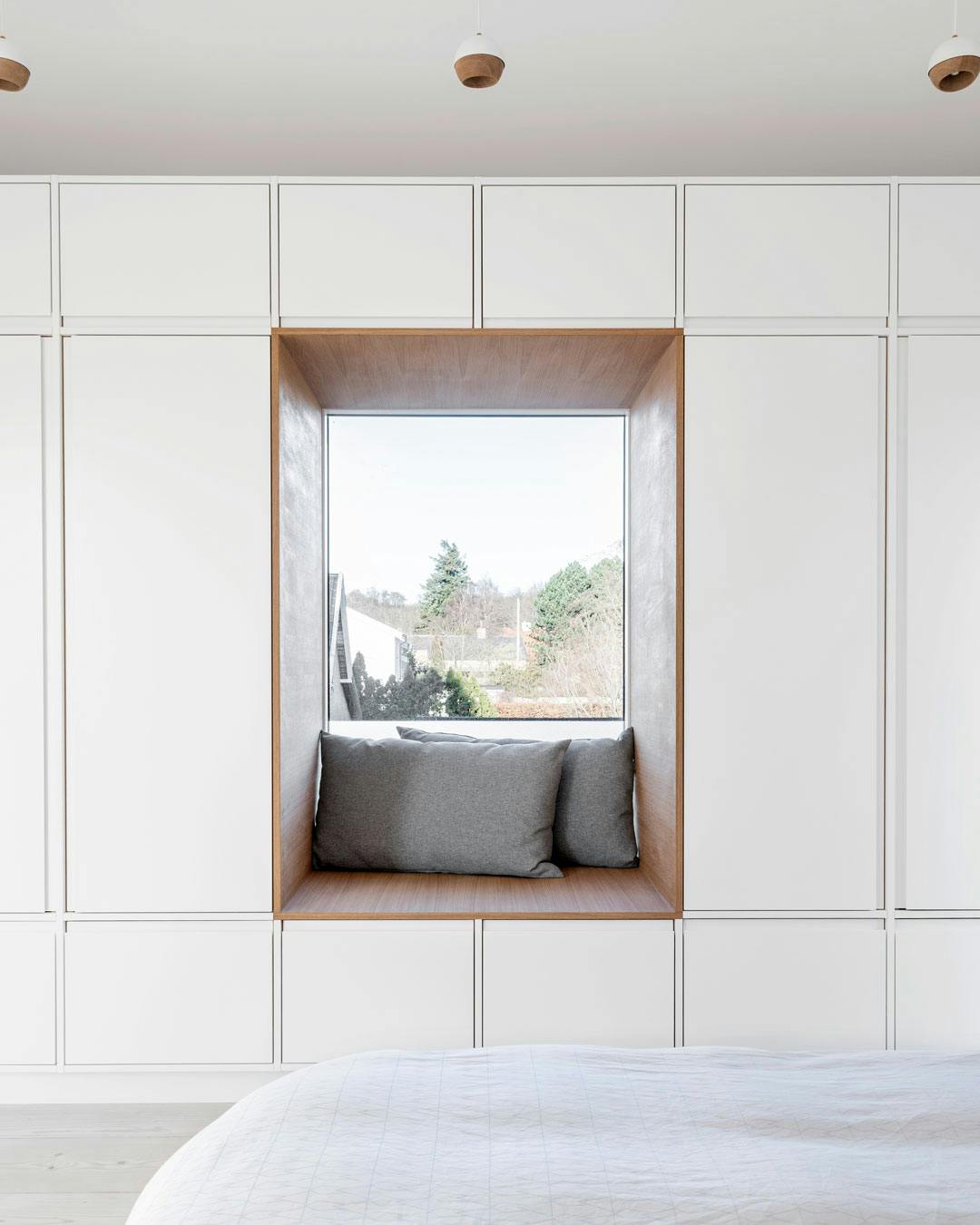Den store skabsvæg er brudt af en niche ved vinduet. Det giver en lethed til opbevaringsvæggen og mulighed for at tage en slapper med udsigt. Skabene er fra Handcrafted Interior.