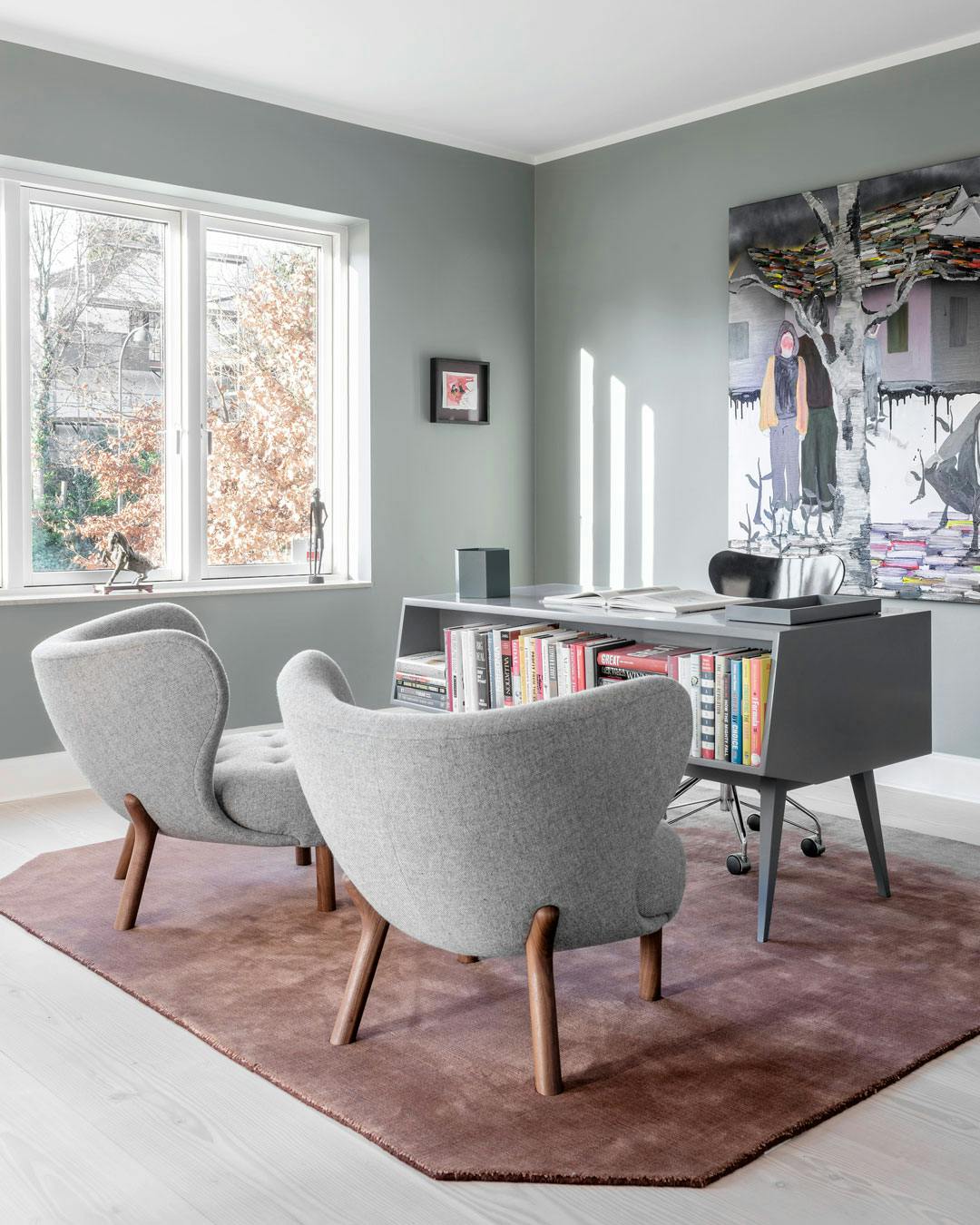 Kontorets vægge skiller sig ud fra de øvrige hvide og grå flader i hjemmet med deres grønne farve. Det gør rummet roligt og lidt mindre stringent i udtrykket end de øvrige værelser.