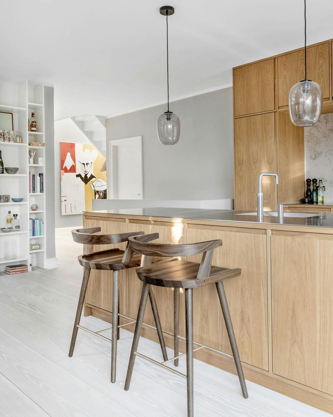 Køkkenelementerne i olieret eg og de mørke barstole giver rummet en varme, der får køligt modspil af stålbordpladen. Køkkenet er fra Handcrafted Interior, og lamperne er fra Bolia.