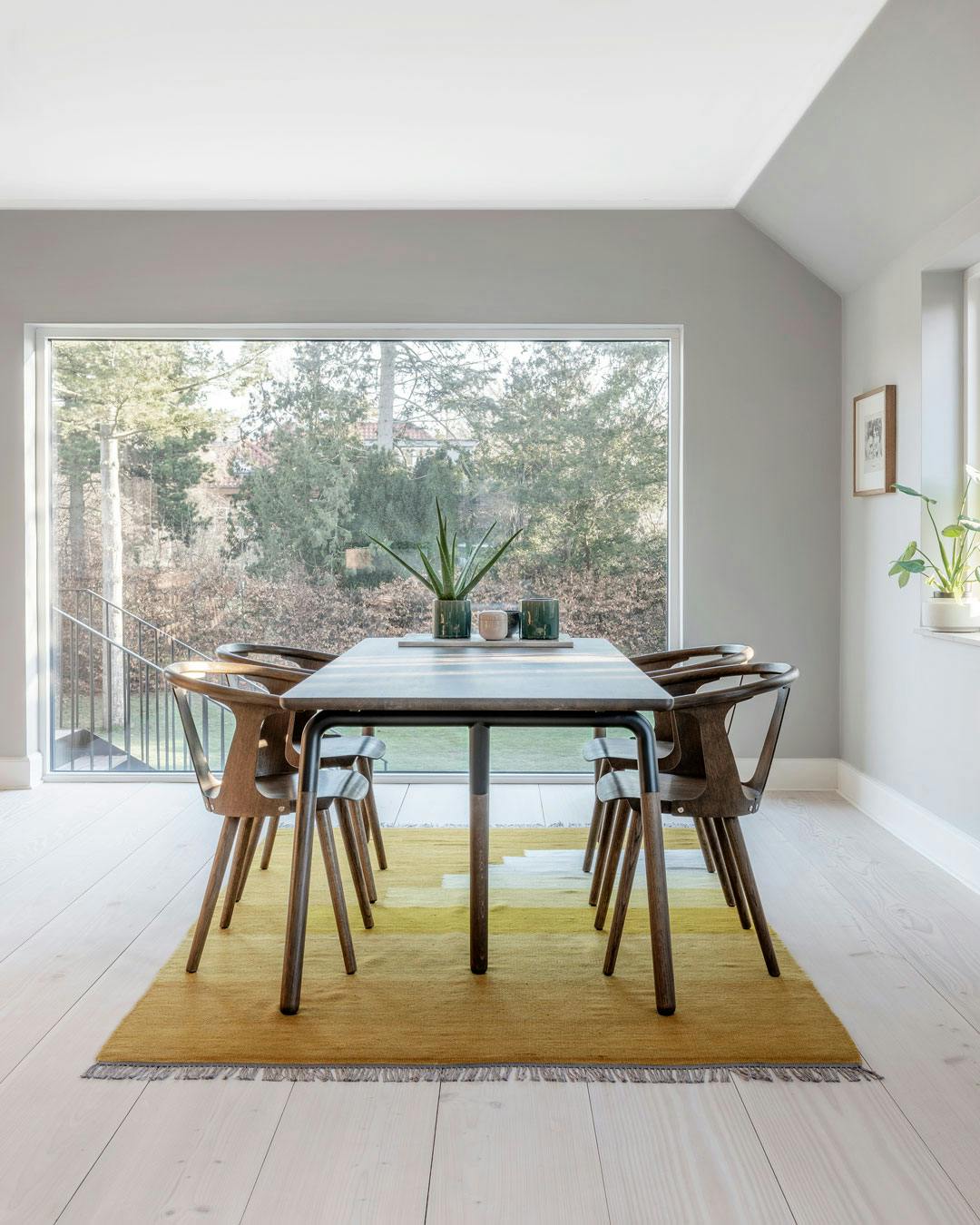 Et tæppe i en iøjnefaldende farve er ideelt til at definere spisearealet i et stort køkken-alrum. Borde, stole og tæppe er fra &Tradition.