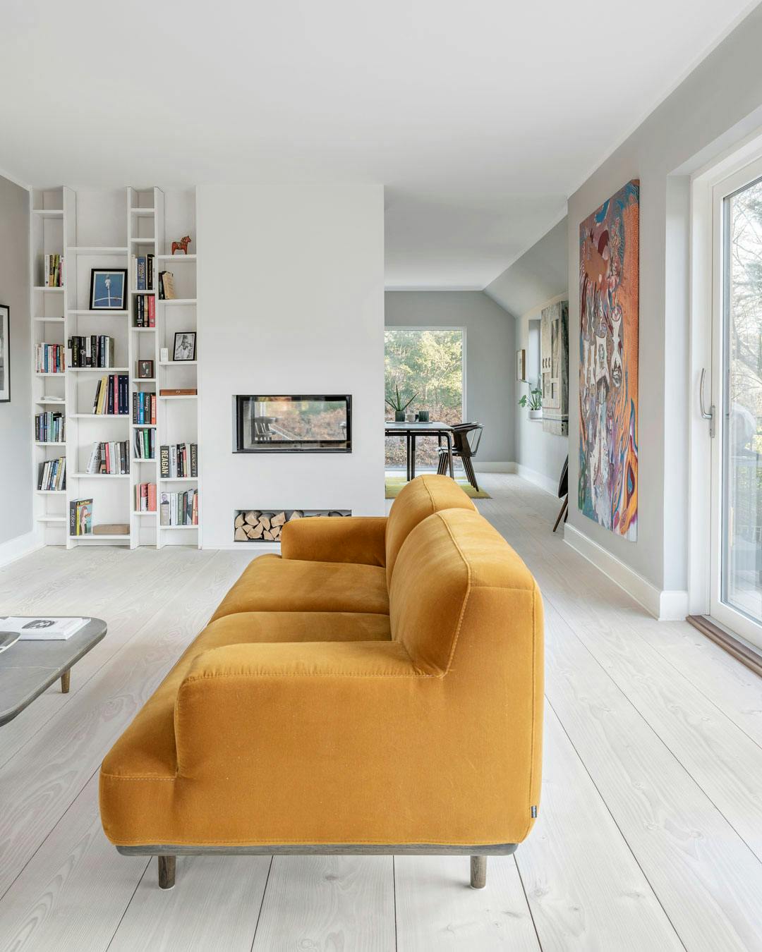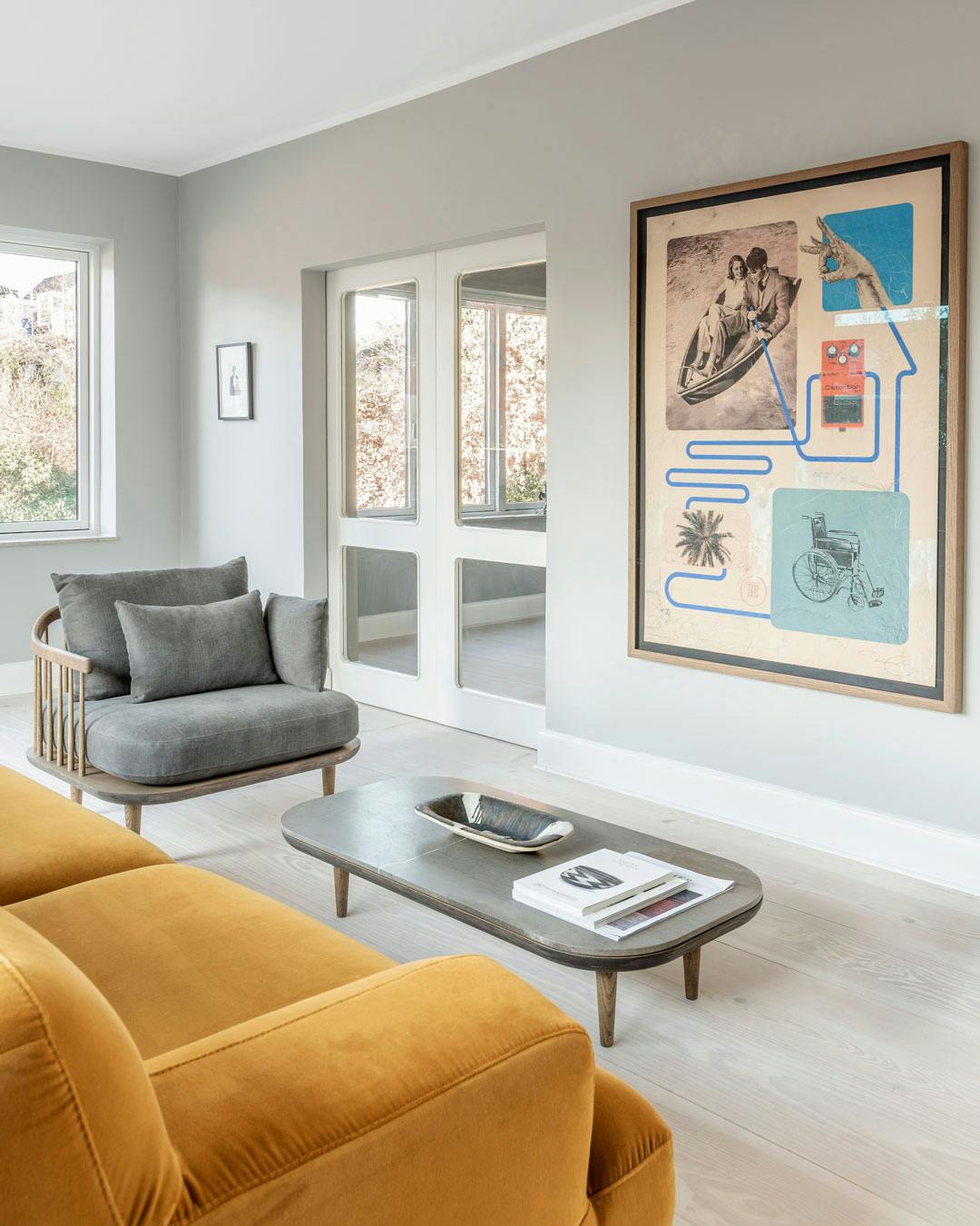 Stuen domineres af den gule sofa og den farverige kunst, som giver liv til den ellers afdæmpede indretning. Sofaen er fra Bolia, og lænestolen og sofabordet fra &Tradition. Billedet er lavet af Kasper Eistrup.