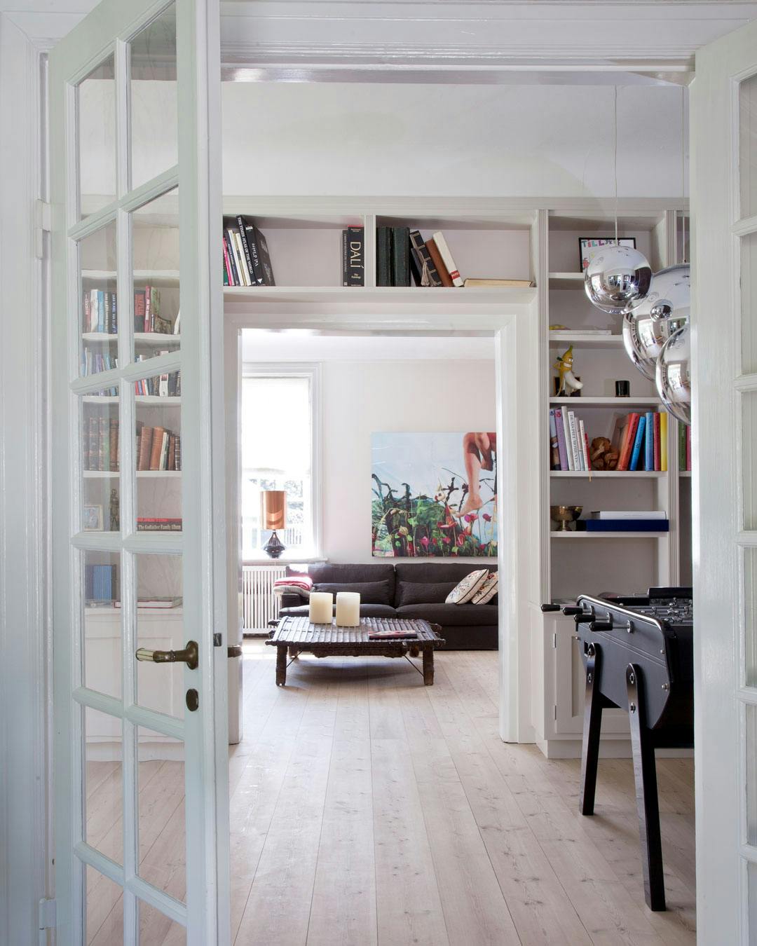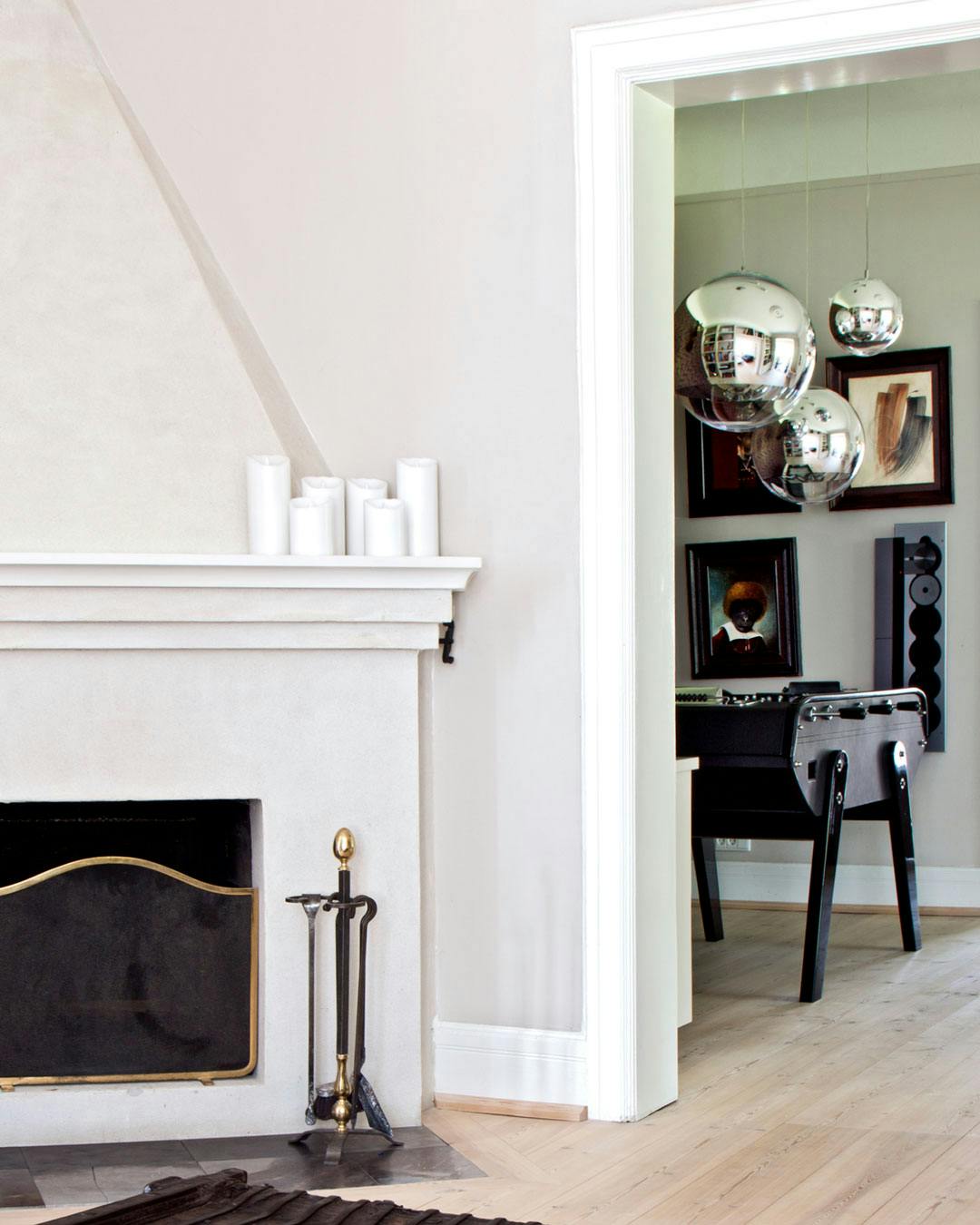 Et kig fra stuen til fodboldspillet i ’drengeværelset'. Det er kun i højsommeren, der ikke er ild i pejsen.