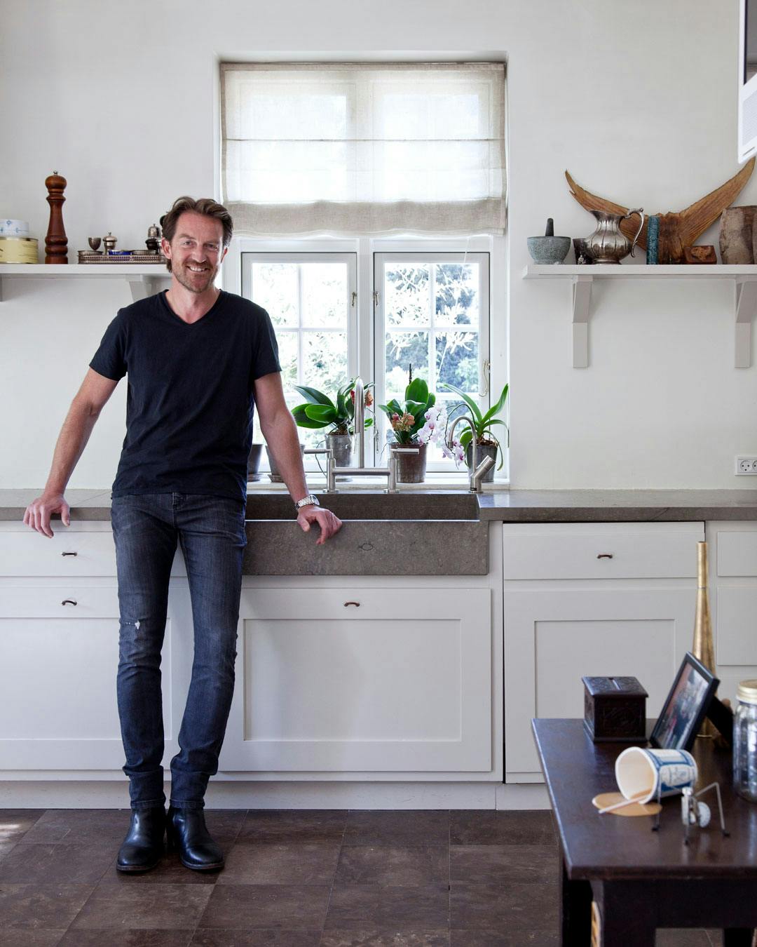 Carsten Friis i køkkenet, der er husets hjerte og gemmer på historier fra familien. Fiskehalen på hylden til højre er fra hans mormors præmietun, som hun fangede i Øresund.