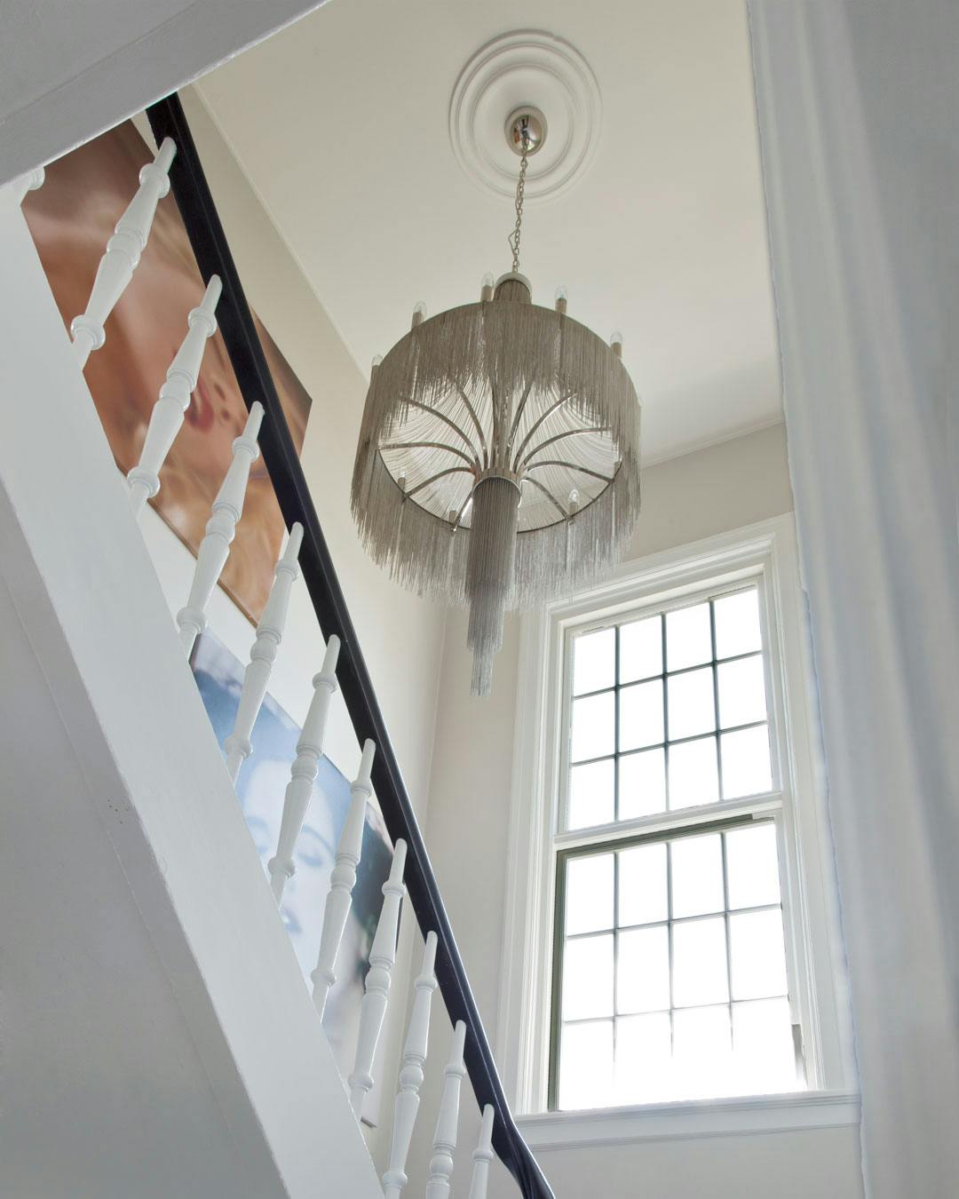 Brug markante lamper til at give dit hjem et personligt udtryk. Lysekronen her ved trappen er fra Rue Verte.