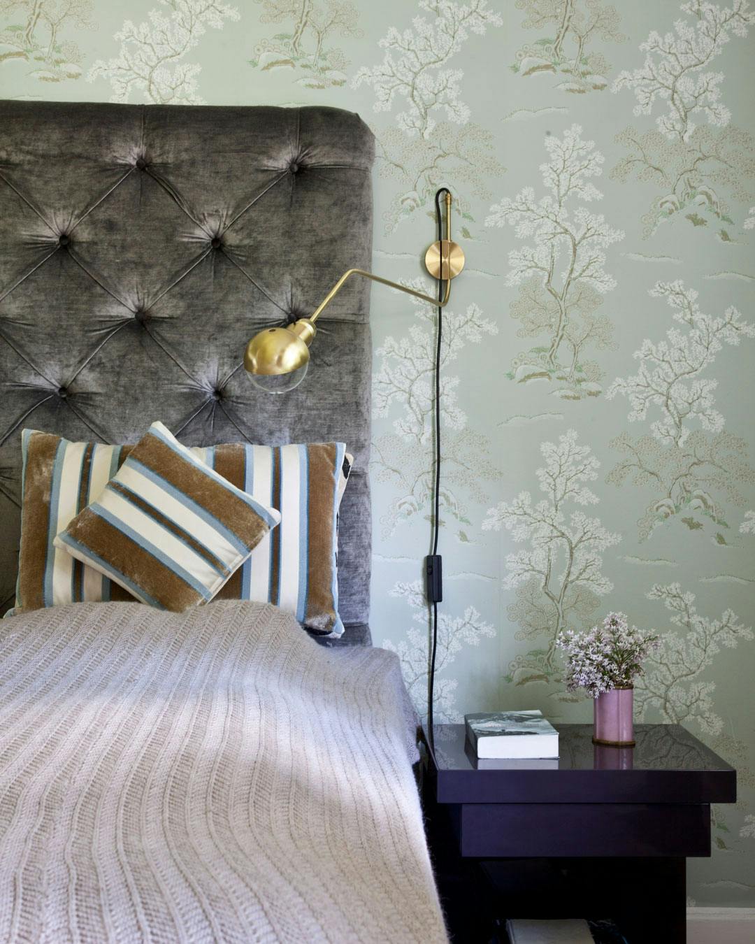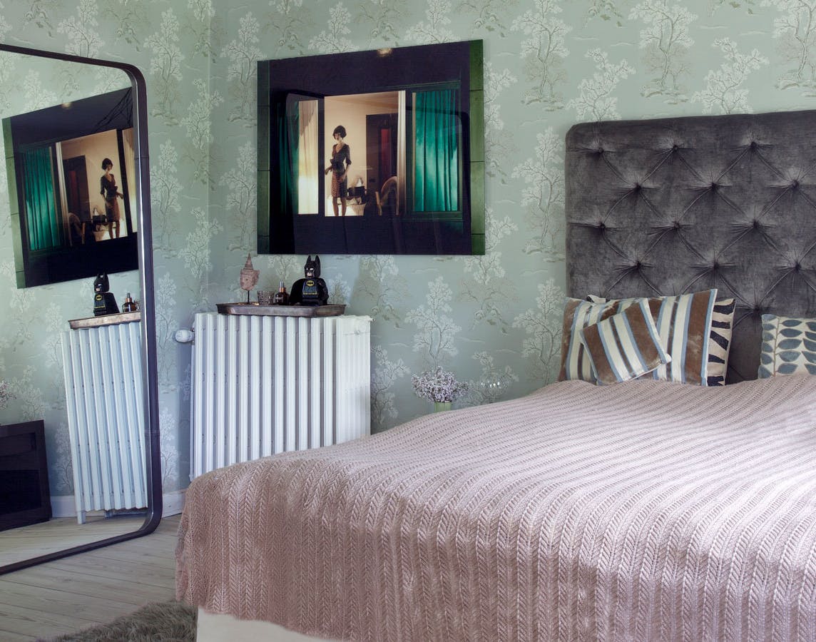 Få cool Las Vegas-hotelstil i soveværelset med bløde tekstiler og douce farver. Hovedgærdet af velour er fra Rue Verte.