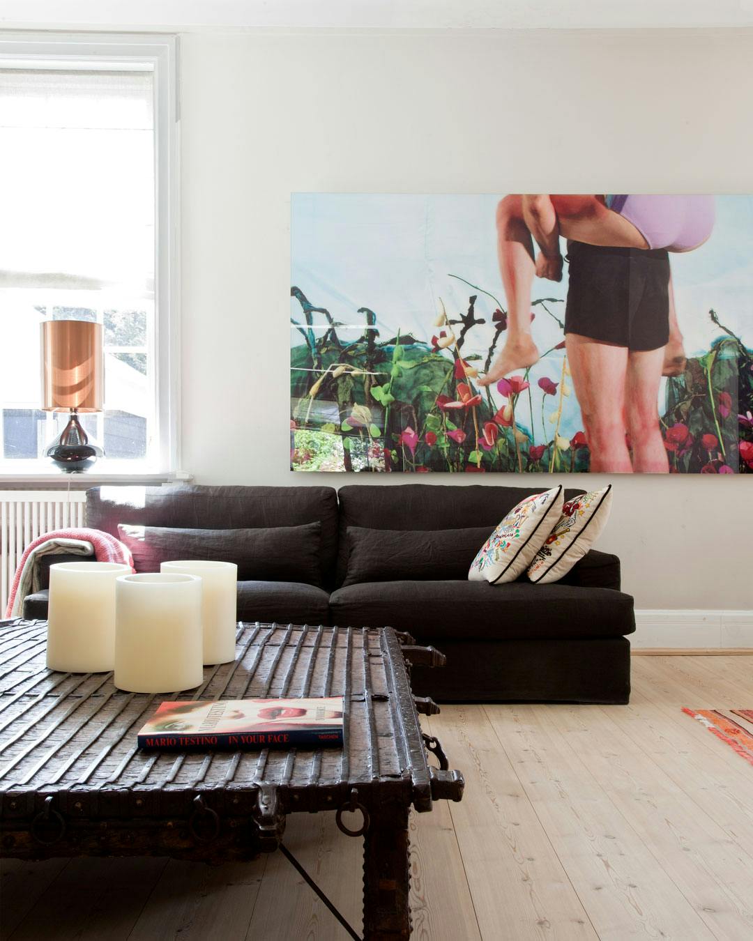 Drømmer du om at indrette din stue til uhøjtideligt samvær, så vælg magelige sofaer i en praktisk farve og et rustikt sofabord. Sofaerne er fra Meridiani, og bordet er bygget af en gammel indisk port. Sæt farvestrålende kunst til, her et næsten tre meter langt stykke fotokunst af Sabine Dehnel.