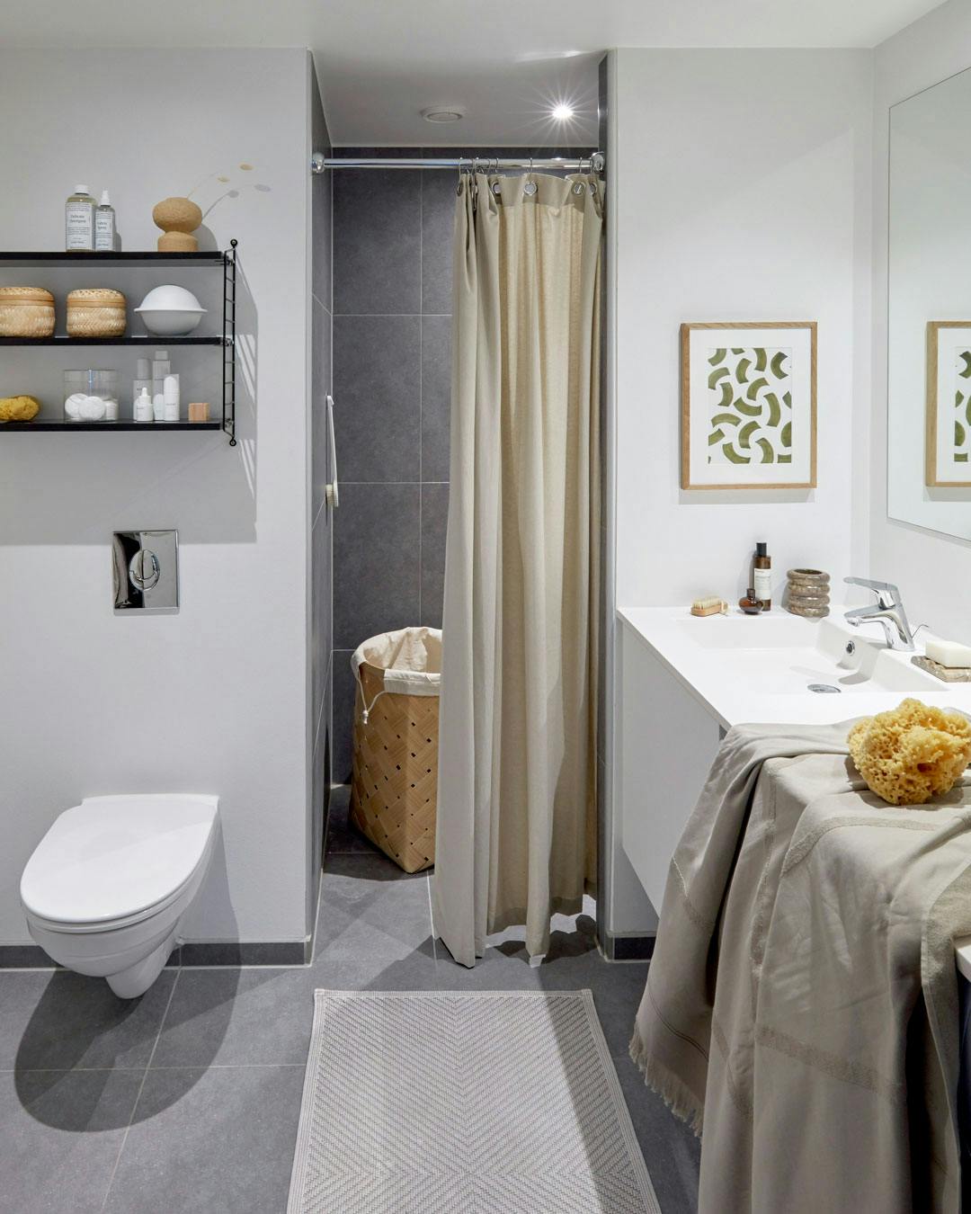 Badeværelset er indrettet simpelt og stringent, men opgraderet med stemningsfulde detaljer, som giver varme til rummet. Hylden er fra Sting, bruseforhænget fra Ferm Living, og kurven fra Lillerød.