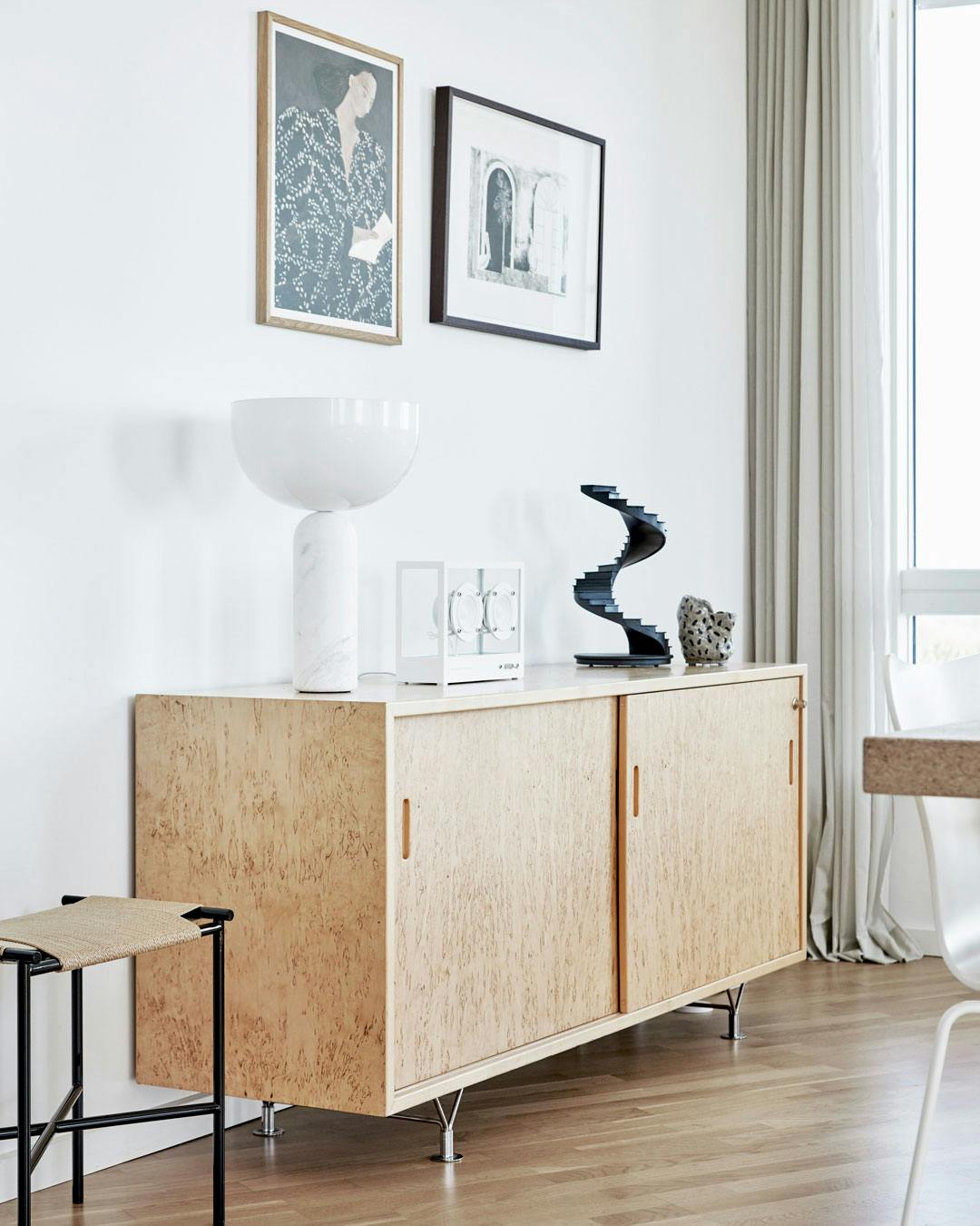 På skænken designet af Bruno Mathsson i 1950’erne står en lampe fra New Works, og over den hænger et billede fra Fine Little Day. Skamlen er fra Skagerak.