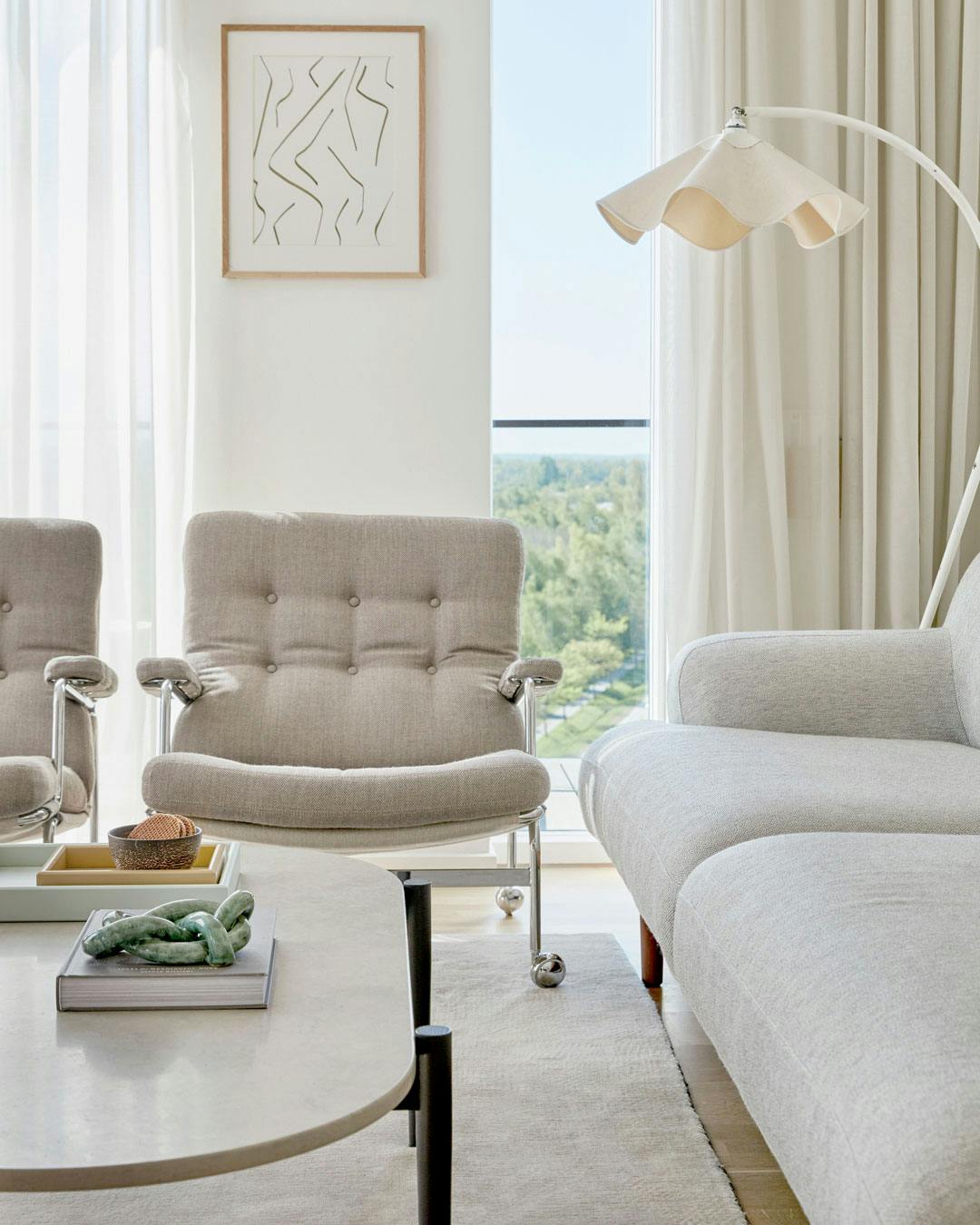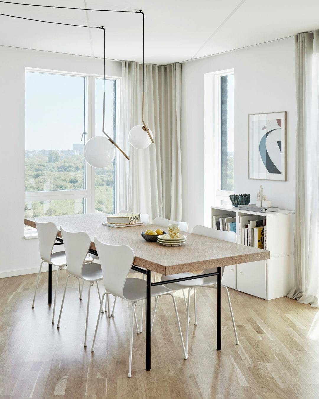 Overalt i lejligheden er der leget med organiske bløde former i kontrast til de helt retvinklede linjer og figurer. De kantede streger på vægkunsten, som Caroline Birk Bahrenscheer selv har kreeret, står i stærk kontrast til det bløde grønne landskab over Amager Fælled uden for vinduerne.