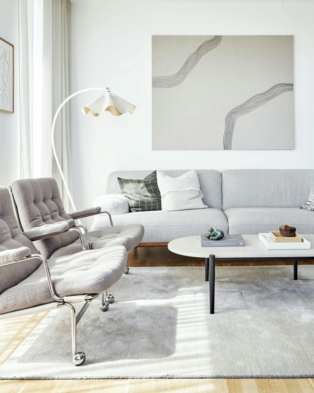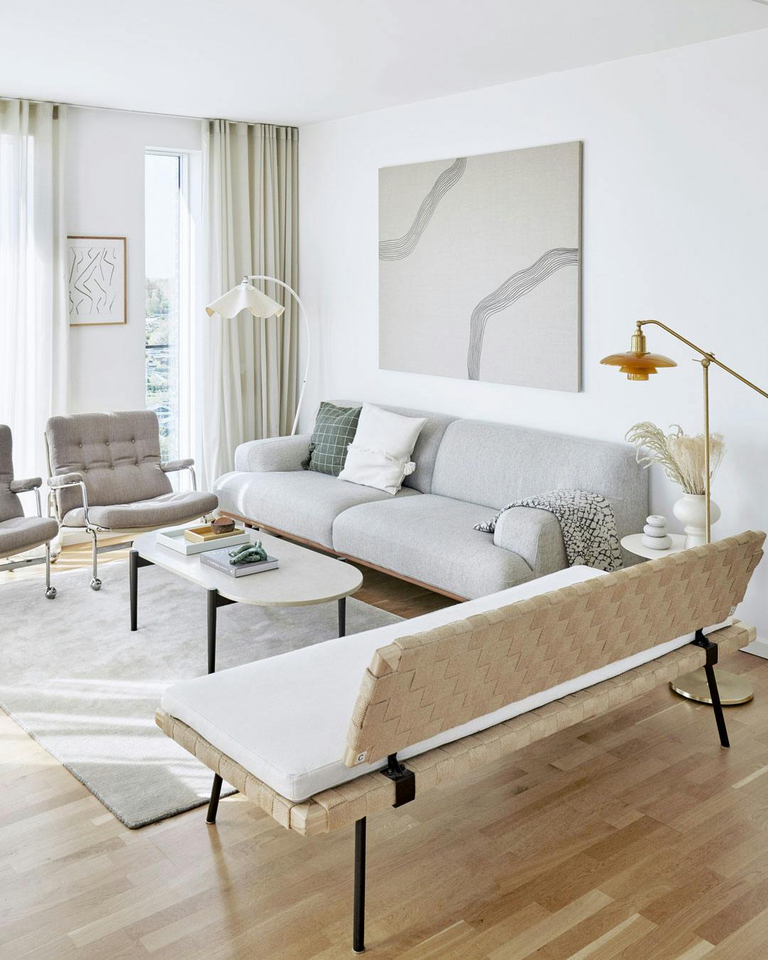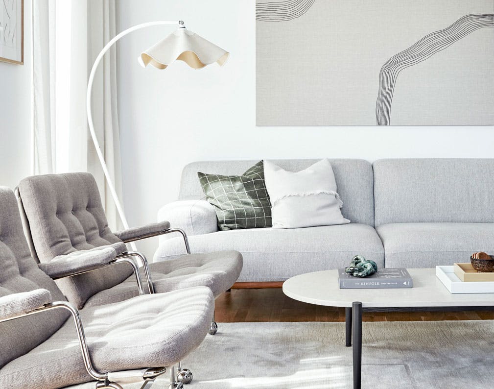 Det ovale bord i travertin fra Menu danner centrum i stuen. Billedet over sofaen fra Bolia er et stykke akryl, som Caroline Birk Bahrenscheer selv har malet. Den bølgende lampe i hjørnet er et vintagefund fra Stockholms Auktionsverk, tæppet er fra &Tradition, og puderne er fra Aiayu. Daybed'en er ligesom spisebordet designet af Ilse Crawford i et samarbejde med Ikea i 2015 under navnet Sinnerlig.