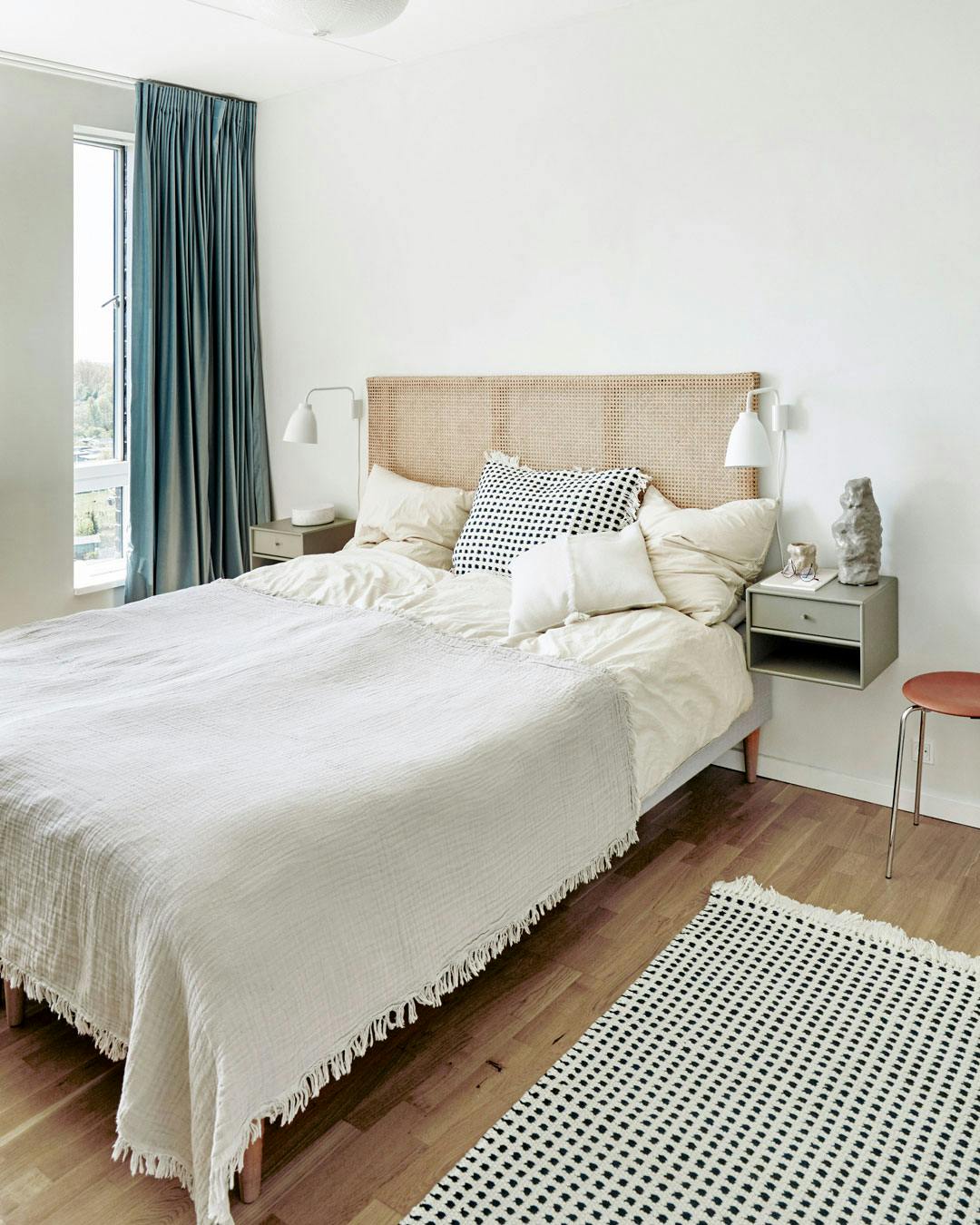 Her møder de glatte overflader på sengebordene fra Montana en sengegavl i hullet fransk flet, mens tekstilerne på sengen spænder fra glat, knitrende bomuld til mere ruflede grove overflader. Sengetøjet er fra Aiayu, sengetæppet fra & Tradition og puderne fra Aiayu og Ferm Living. Lamperne er fra Fritz Hansen, og skulpturerne er lavet af Caroline Birk Bahrenscheers selv.