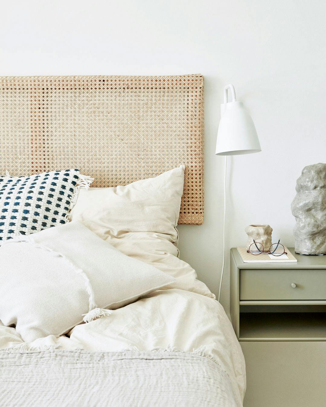 Sengegavlen i fransk flet er et af de DIY-projekter, som Caroline Birk Bahrenscheer deler på sin blog septemberedit.com. Gavlen er lavet af en reolside fra Ikea og fransk flet købt på mål.